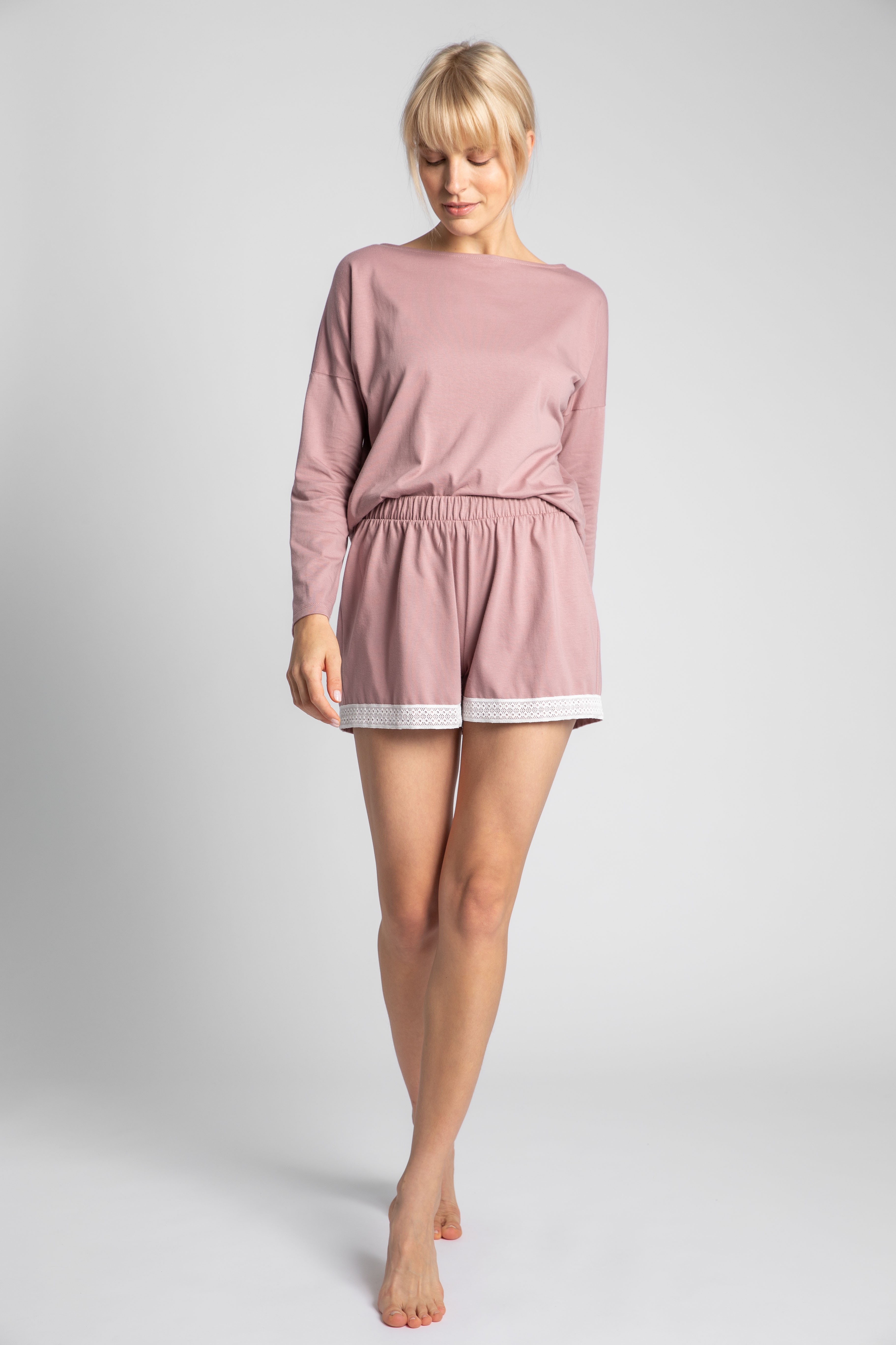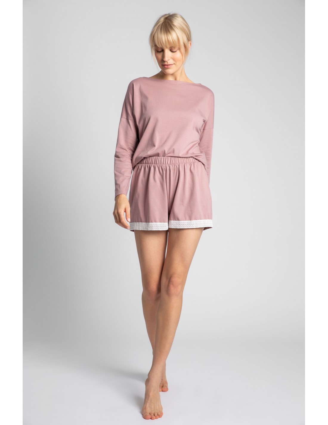 Krótko i na temat. Połącz swoją ulubioną górę od piżamy z przyjemnymi dla ciała szortami z oddychającej bawełny wykończonymi koronką. Praktycznie i uroczo! Wyprodukowano w Polsce.