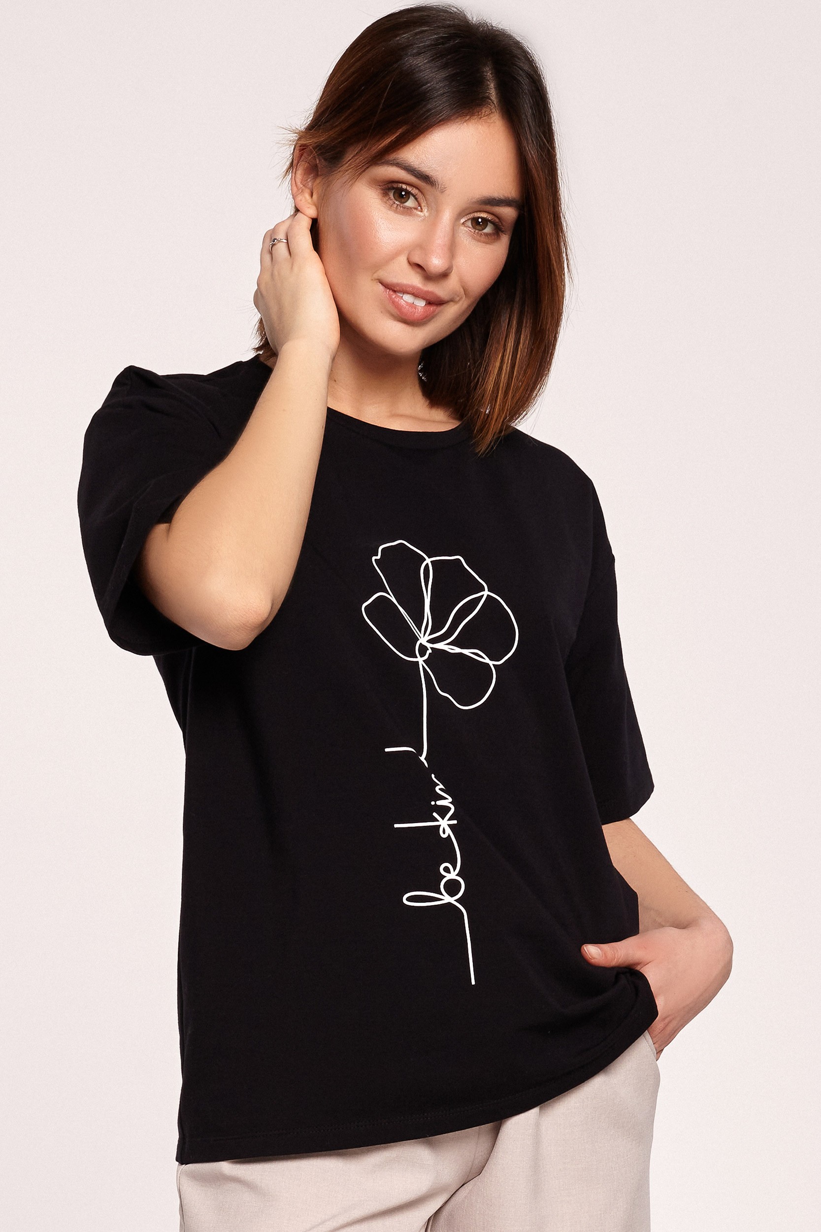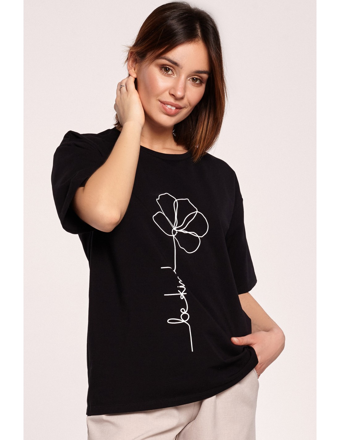 Dłuższe t-shirty są ostatnio bardzo osadzone w trendach. Prosty i swobodny krój to coś dla wielbicielek minimalistycznych modeli. Czarny t-shirt o przedłużonym kroju będzie wyglądał dobrze luźno puszczony, jak i delikatnie wpuszczony przodem w spodnie. Idealnie komponują się z nim spodenki typu kolarki z dopasowanymi, dłuższymi nogawkami oraz sportowe buty i czapka z daszkiem - trend alert! Z powodzeniem założysz go do spodni z szerokimi nogawkami, klasycznych jeansów czy spodni dresowych. Uroczy nadruk z kwiatkiem i hasłem “be kind” stanowi świetną ozdobę przodu. Został on wykonany metodą sitodruku, która zapewnia wysoką trwałość i żywotność koloru. T-shirt wyprodukowaliśmy w Polsce z dbałością o najwyższą jakość produktu.