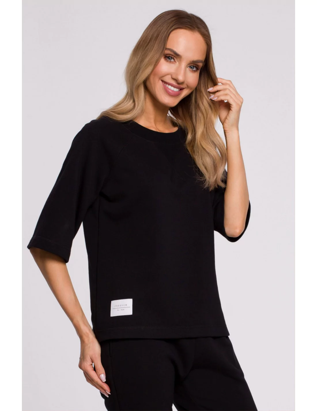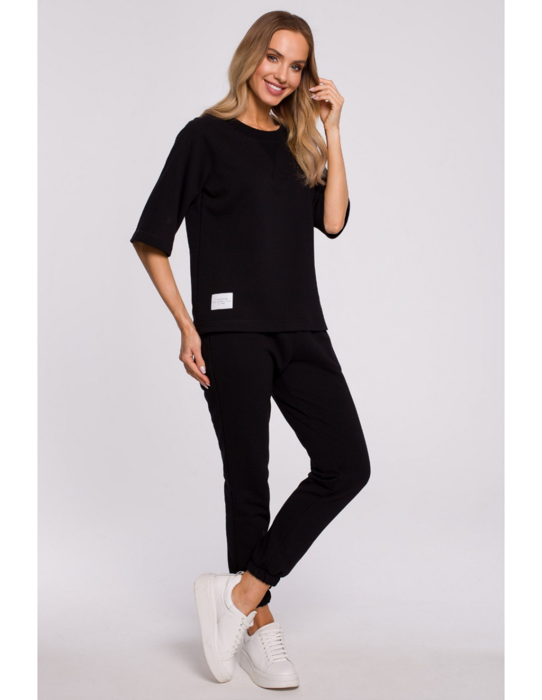 Kochasz bluzy, ale kiedy przychodzi cieplejsza pora musisz odłożyć je do szafy? Otóż mamy dla Ciebie świetną alternatywę - czarną luźną bluzę z krótkimi rękawami. To dzięki niej możesz nawet latem cieszyć się mięciutką i super wygodną bluzą. Ubierz ją na wycieczkę rowerową, spacer z dzieckiem czy zakupy a nie pożałujesz! To w niej poczujesz się stylowo i wygodnie jednocześnie. Luźny rękaw o przedłużonym kroju na pewno nie ograniczy Ci ruchów, także nawet w samochodzie będziesz mogła odczuć tę swobodę użytkowania. Świetnie współgra ze spodniami dresowymi lub jeansami w szarym bądź klasycznym odcieniu, szortami oraz sportowymi butami. Model wyprodukowany w Polsce.