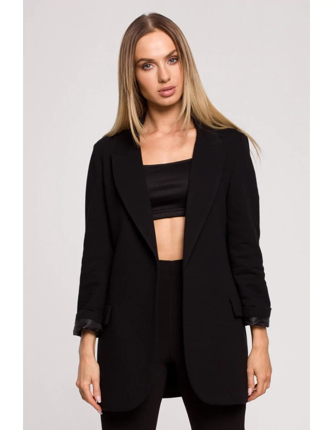 Czarny żakiet w wersji casual! Takie propozycje kochamy na co dzień, kiedy do dzianinowej sukienki potrzebujemy zarzucić coś równie przyjemnego. Niedopasowana marynarka damska typu boyfriend z kołnierzem. Długie rękawy możesz podwinąć i stworzyć jeszcze bardziej sportowy look. W pracy poczujesz się komfortowo, a poza tym będziesz pewna, że wyglądasz znakomicie niezależnie od ilości zadań i pory dnia. Żakiet możesz zarzucić na bluzkę, elegancką koszulę lub sportową sukienkę. Stylizację śmiało uzupełnij sportowymi butami typu sneakers i ciesz się maksymalną wygodą na co dzień. Ten produkt został uszyty w Polsce.