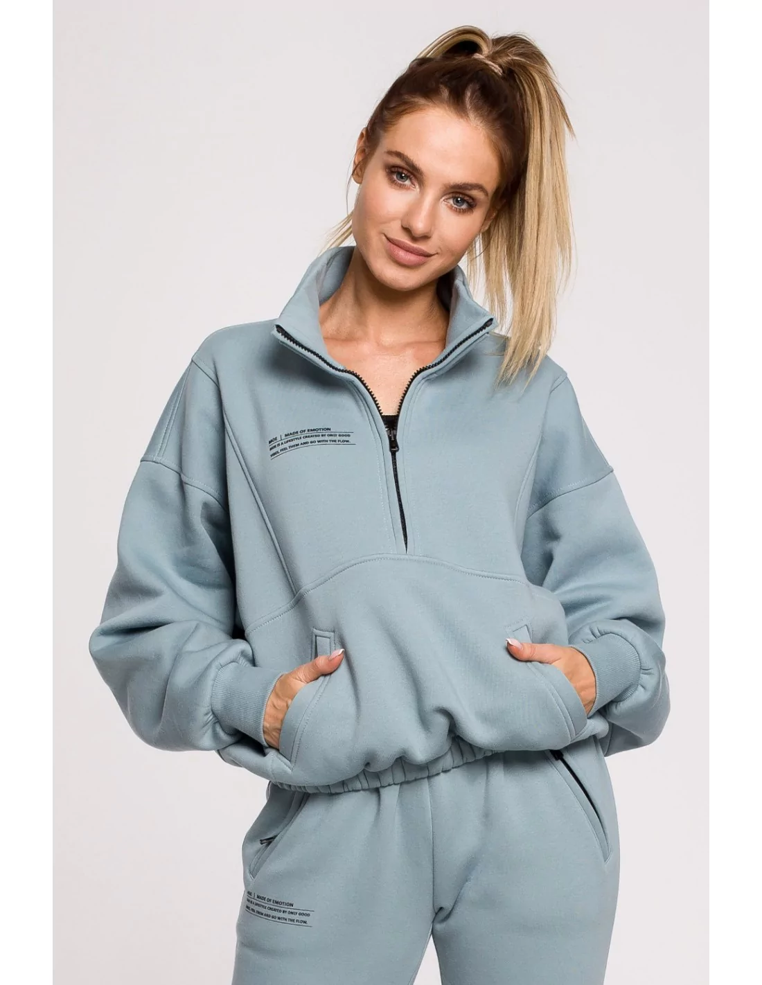 Bluza w stylu „urban style”, w cudownym kolorze agawy, zakładana przez głowę z podwójnym, wysokim kołnierzem zasuwanym na kontrastowy zamek i z kontrastowym nadrukiem - definicją MOE. Gruba bawełniana dzianina, drapana od spodu, dająca uczucie ciepła i komfortu stanowi idealny materiał dla idealnej bluzy na co dzień niezależnie, czy wybierasz się na trening, czy po prostu potrzebujesz komfortowej góry do spodni dresowych. Luźny fason zebrany gumą u dołu bluzy i ze ściągaczami u dołu rękawów pozwala formować bluzę dowolnie - wysoko nad talią lub nosić naciągniętą na biodra. To wielofunkcyjny element garderoby na lata. Uszyto w Polsce.