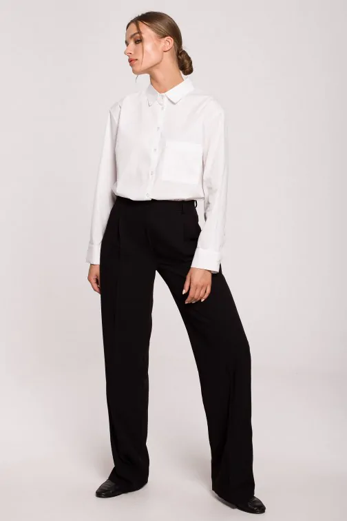 Klasyczne spodnie z lekko poszerzanymi, prostymi nogawkami na kant pozwolą Ci wygodnie poczuć się podczas długich dni w biurze lub weekendowych wyjść na miasto. Posiadają wysoką talię, która pozwala na noszenie spodni zarówno z bluzkami, jak i klasyczną koszulą lub swetrem. Po bokach mają kieszenie, a w pasie szlufki, przez które możesz włożyć ozdobny pasek. Z tyłu posiada gumę, która daje jeszcze większy komfort noszenia na co dzień. Czarne spodnie możesz połączyć z elegancką bluzką oraz marynarką i stworzyć garnitur damski, w którym poczujesz się wyjątkowo i będziesz prezentować się profesjonalnie. Spodnie uszyliśmy w Polsce.