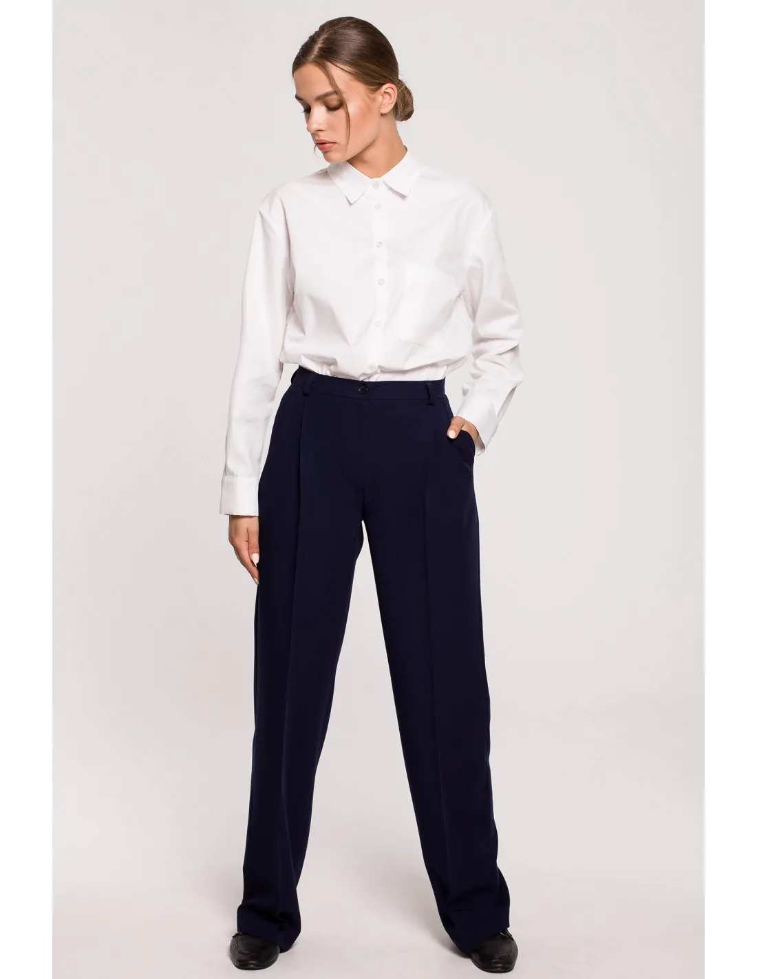 Klasyczne spodnie z lekko poszerzanymi, prostymi nogawkami na kant pozwolą Ci wygodnie poczuć się podczas długich dni w biurze lub weekendowych wyjść na miasto. Posiadają wysoką talię, która pozwala na noszenie spodni zarówno z bluzkami, jak i klasyczną koszulą lub swetrem. Po bokach mają kieszenie, a w pasie szlufki, przez które możesz włożyć ozdobny pasek. Z tyłu posiada gumę, która daje jeszcze większy komfort noszenia na co dzień. Granatowe spodnie możesz połączyć z elegancką bluzką oraz marynarką i stworzyć garnitur damski, w którym poczujesz się wyjątkowo i będziesz prezentować się profesjonalnie. Wyprodukowano w Polsce.