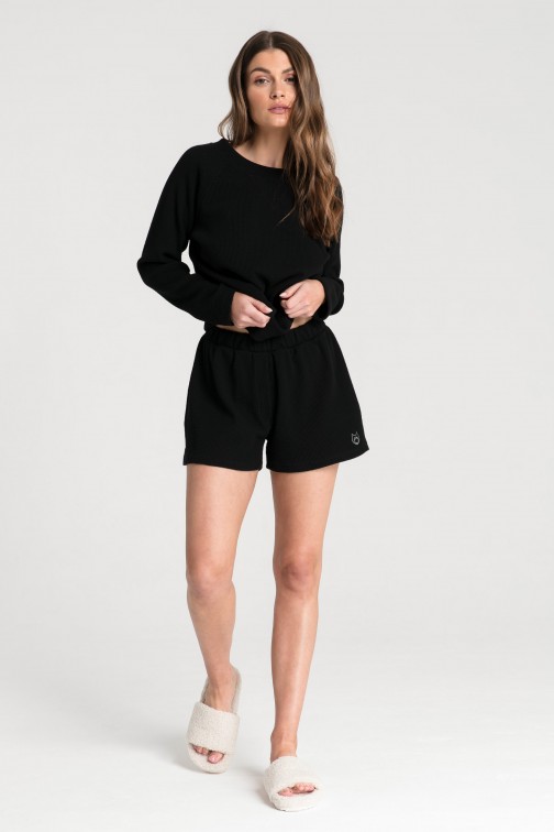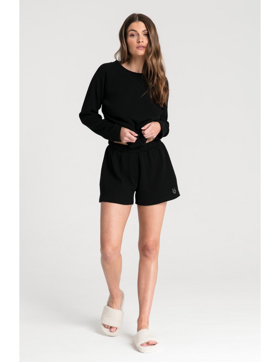 Klasyczne, czarne szorty, które założysz do spania, ale nie tylko. Możesz w nich spędzać czas tak, jak lubisz najbardziej. Maraton filmowy, ciepły kocyk, gorąca czekolada i ulubiona książka, a może telefon do najlepszej przyjaciółki i wieczorne ploteczki? Te szorty będą z Tobą w każdej z tych sytuacji po to, żebyś mogła w pełni oddać się przyjemnościom i zrelaksować się na maksa. W pasie posiadają gumkę, która skutecznie dopasuje się do Twojej sylwetki, nogawki zakończone są niewielkimi rozcięciami po bokach. Na lewej nogawce umieszczony został wyhaftowany wilk, który jest symbolem marki Lalupa Homewear. Szorty zostały wyprodukowane w Polsce.