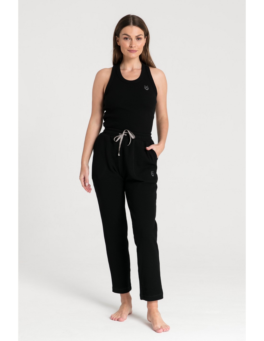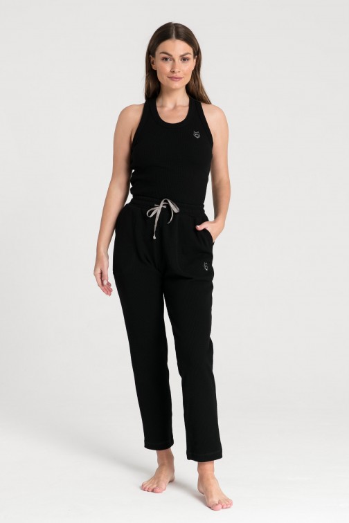 Miękkie, komfortowe i ciepłe spodnie to coś, czego potrzebuje każda z nas, kiedy robi się zimno. Na okres jesienno-zimowy warto zadbać o swój komfort fizyczny, ale też psychiczny. Do Twojej garderoby mogą dołączyć spodnie, które będą czekać w gotowości każdego dnia, kiedy wrócisz z pracy lub uczelni, by spędzić przyjemne popołudnie. Czarne spodnie zostały uszyte z przyjemnej dzianiny typu wafelek, która posiada ciekawą strukturę i z pewnością pozytywnie Cię zaskoczy. Ponadto ten model ma kieszenie, elastyczną gumę w pasie oraz minimalistyczny haft, który wyróżnia go spośród innych. Połącz go z topem wykonanym z tego samego materiału lub pluszową bluzą, w którą z chęcią wskoczysz każdego wieczora. Spodnie zostały wyprodukowane w Polsce.