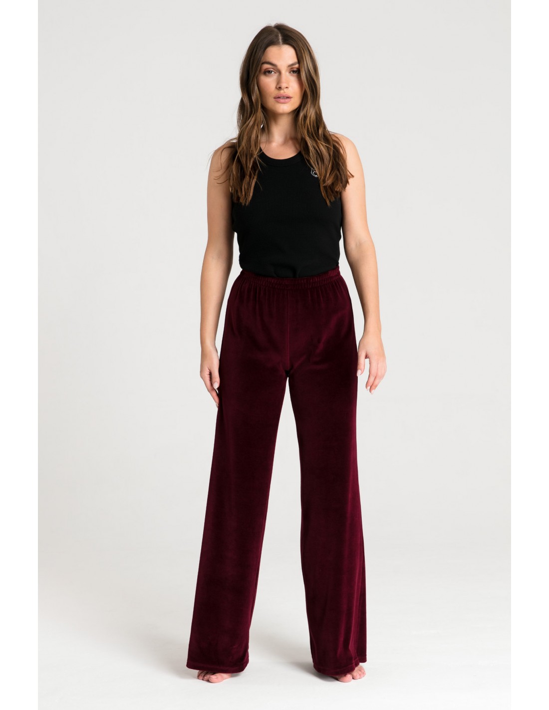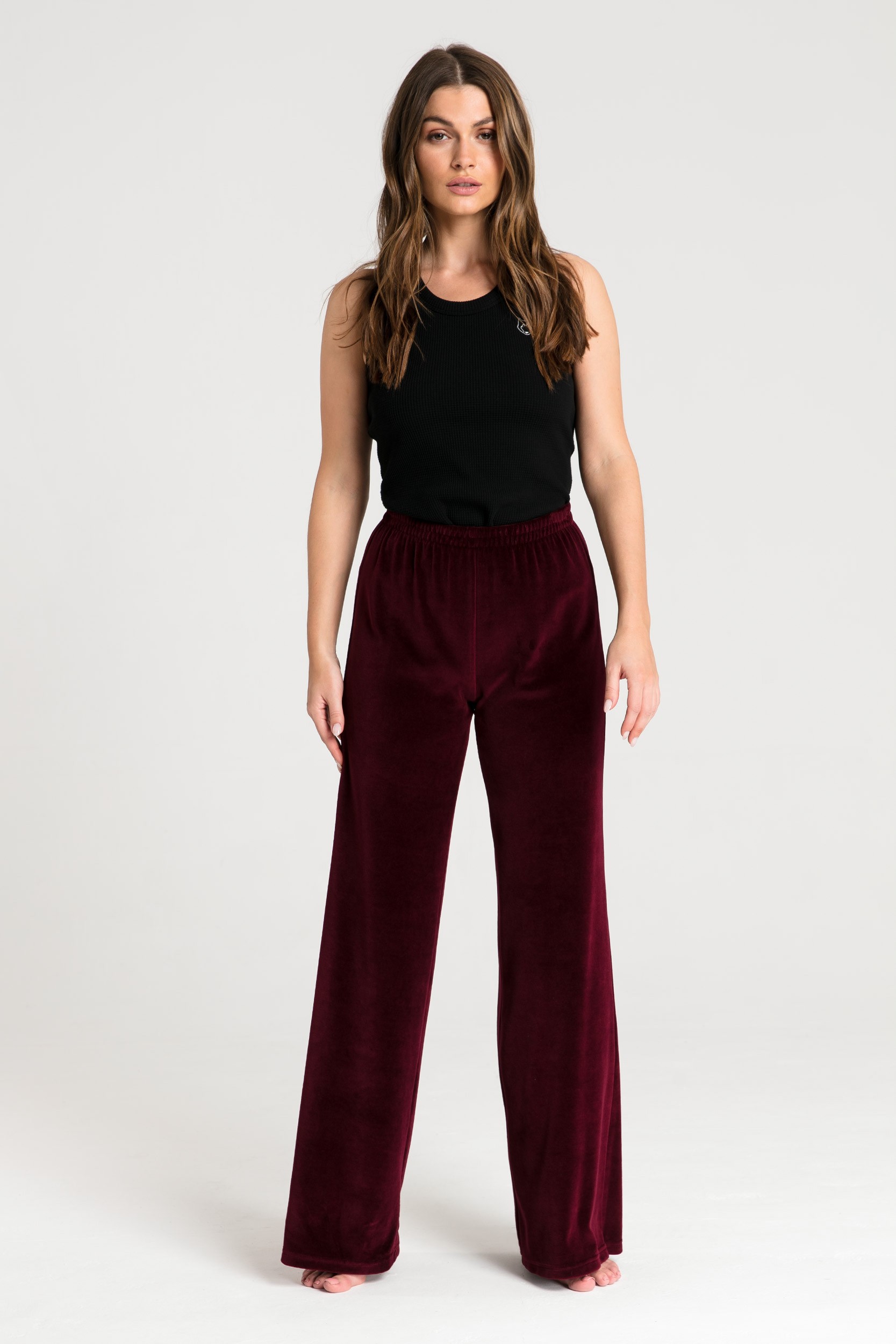 Spodnie dresowe tylko do domu? Niekoniecznie! Zostały zaprojektowane, żebyś mogła poczuć się stylowo i pięknie, gdziekolwiek będziesz. Jeśli masz ochotę na coś luźnego, niekrępującego i miękkiego - wybierz nasze bordowe spodnie wykonane z przyjemnego weluru. Posiadają szerokie nogawki do samej ziemi i elastyczną gumę w pasie. Możesz założyć je do koszulki nocnej lub topu, a na to zarzucić szlafrok i prezentować się bardzo elegancko przed oraz po obudzeniu. Innym razem złap za bluzę, załóż ją na siebie i wyjdź na długi spacer. Masz wiele możliwości, korzystaj z nich jak chcesz i ile chcesz! Ten produkt został uszyty w Polsce.