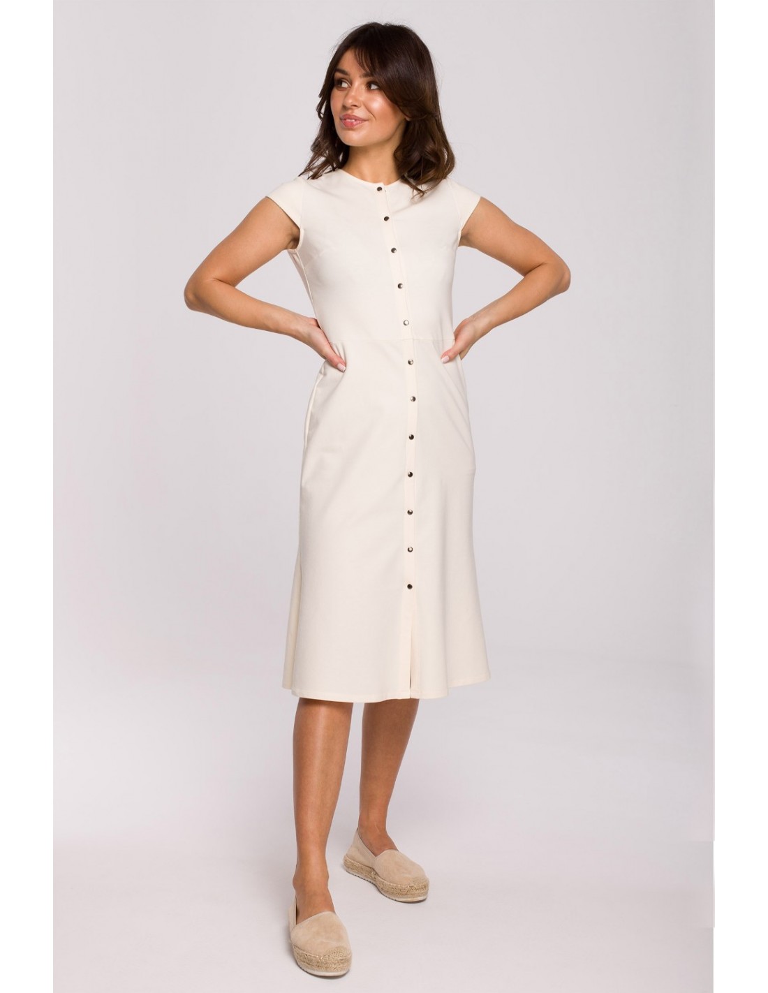 Marzysz o nowej sukience na sezon wiosenno-letni? Chcesz, żeby była wygodna, zwiewna i do tego prezentowała Cię w dobrym świetle? Z czystym sumieniem możemy polecić Ci tę śmietankową sukienkę, która została stworzona z cienkiej dzianiny, więc zadba o Twój komfort. To idealna propozycja na wiosenne dni, kiedy promienie słońca delikatnie ogrzewają Twoją skórę. Sukienka posiada fason trapezowy, ale na wysokości biustu ma zaszewki, dzięki czemu góra jest dopasowana. Zapinana z przodu na całej długości na mini napy. Pozwoli Ci poczuć się wyjątkowo w najróżniejszych sytuacjach. Sprawdzi się w outfitach casual oraz eleganckich. Ten sezon będzie należał do Ciebie! Sukienkę uszyliśmy w Polsce.