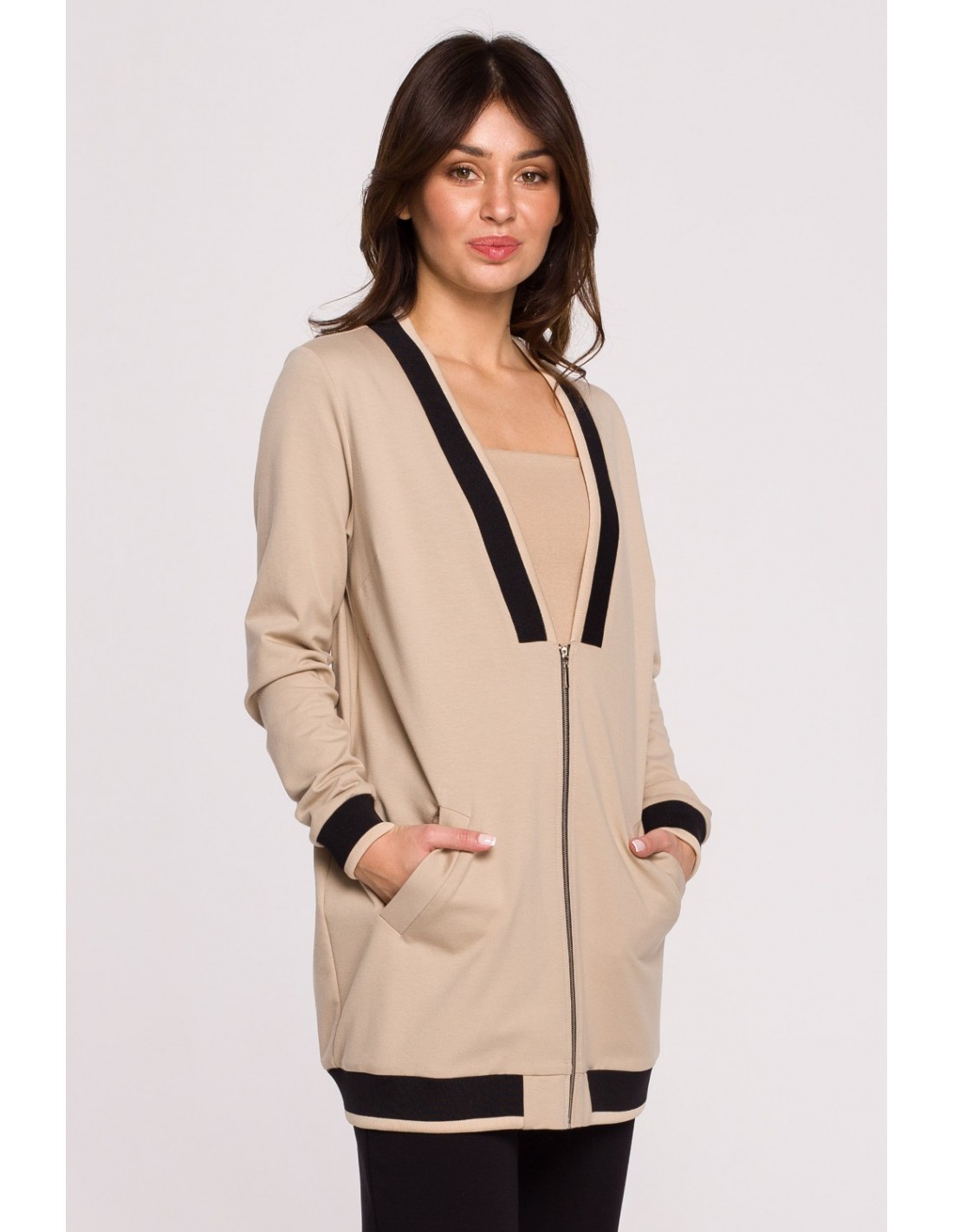 Beżowa bluza z kontrastowymi wstawkami to coś, czego być może od dawna szukałaś. Jest to na pewno model, który pozwoli Ci wyróżnić się z tłumu i iść przez życie z większą pewnością siebie. Głęboki dekolt w kształcie litery V jest wykończony ozdobnym ściągaczem. Model zasuwany jest na zamek oraz posiada ukośne kieszenie z przodu. Możesz zarzucić go na siebie podczas chłodnych dni lub wieczorami. Pod spód załóż czarną bluzkę lub zwykły t-shirt, do tego dodaj komfortowe spodnie i Twoja stylizacja jest gotowa. Bluza daje Ci wiele możliwości, dlatego wybierz swój ulubiony kolor i korzystaj z nich śmiało! Wyprodukowano w Polsce.