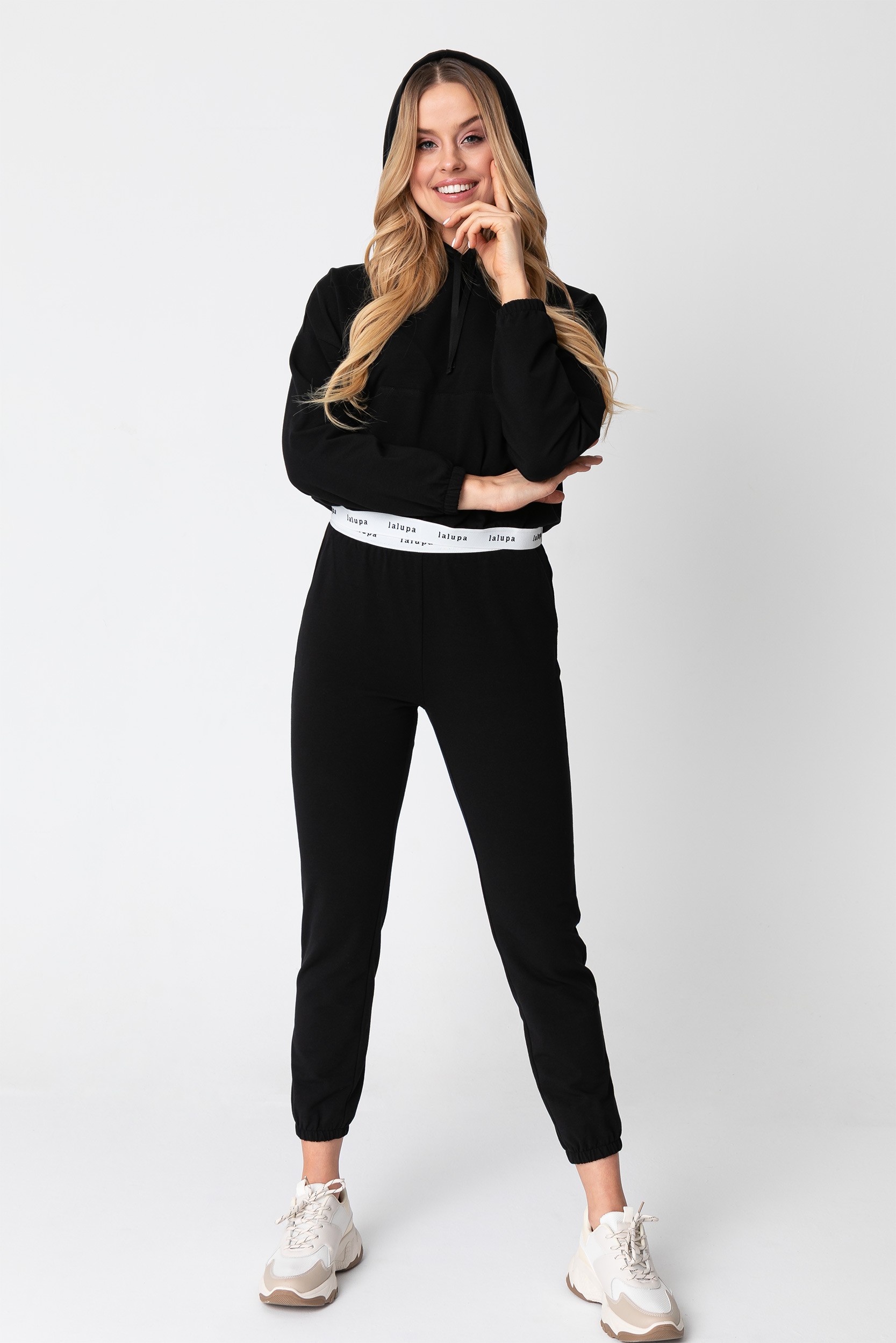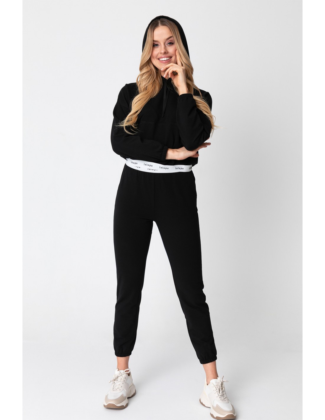 Jeśli szukasz komfortu, a jednocześnie chcesz podkreślić swój styl proponujemy czarne dzianinowe spodnie ze ściągaczami w nogawkach, którym ciekawego designu dodaje biała guma z tłoczonym logo marki. Ten model ma zalety odzieży typu homewear - niesamowicie wygodne, a zarazem stylowe, wykonane z cienkiej, miękkiej i przyjemnej dla ciała bawełny, która bardzo dobrze przepuszcza powietrze, oddycha i wchłania wilgoć. Jest jednocześnie przyjemna w dotyku, nie podrażnia - na pewno docenią je kobiety ze skórą wrażliwą. Będziesz czuć się w nich dobrze zarówno wykonując domowe obowiązki, jak i odprężając się z książką czy odpoczywając na hamaku latem. Pracujesz w domu? Podczas homeoffice możesz pozwolić sobie na pełen luz i zrezygnować z oficjalnego dress code’u na rzecz wygodnego looku. Połącz je z t-shirtem, dopasowanym body lub bluzą w identycznym kolorze z naszej kolekcji. Z powodzeniem możesz zabrać je w podróż, ubrać na plażę czy wyjście do kina z przyjaciółmi. Sportowe buty lub gumowe modne klapki dopełnią stylizację. Spodnie wyprodukowane w Polsce.