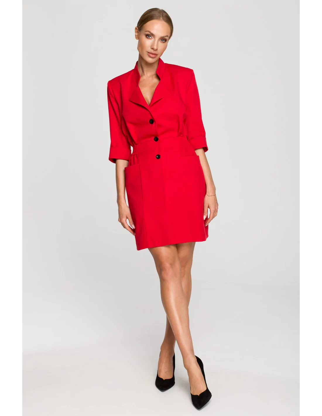 Sukienka inspirowana żakietem idealnie sprawdzi się u Ciebie jako strój na wszelkie eleganckie uroczystości - różnego rodzaju przyjęcia, bankiety, imprezy rodzinne, czy jako oficjalny dress code w biurze. Czerwona żakietowa sukienka mini w połączeniu z butami na obcasie będzie prezentować się bardzo kobieco. Dzięki szerokiej gumie wszytej na tyle sukienki, na wysokości pasa, pięknie dopasowuje się do sylwetki, podkreślając przy tym talię. Dekolt V z wykładanym kołnierzem podkreśla biust. Sukienka posiada rękawy długości do łokcia z mankietami, kieszenie po bokach oraz zapięcie na guziki na przodzie. Całość sięga przed kolano. Sukienka wyprodukowana w Polsce.