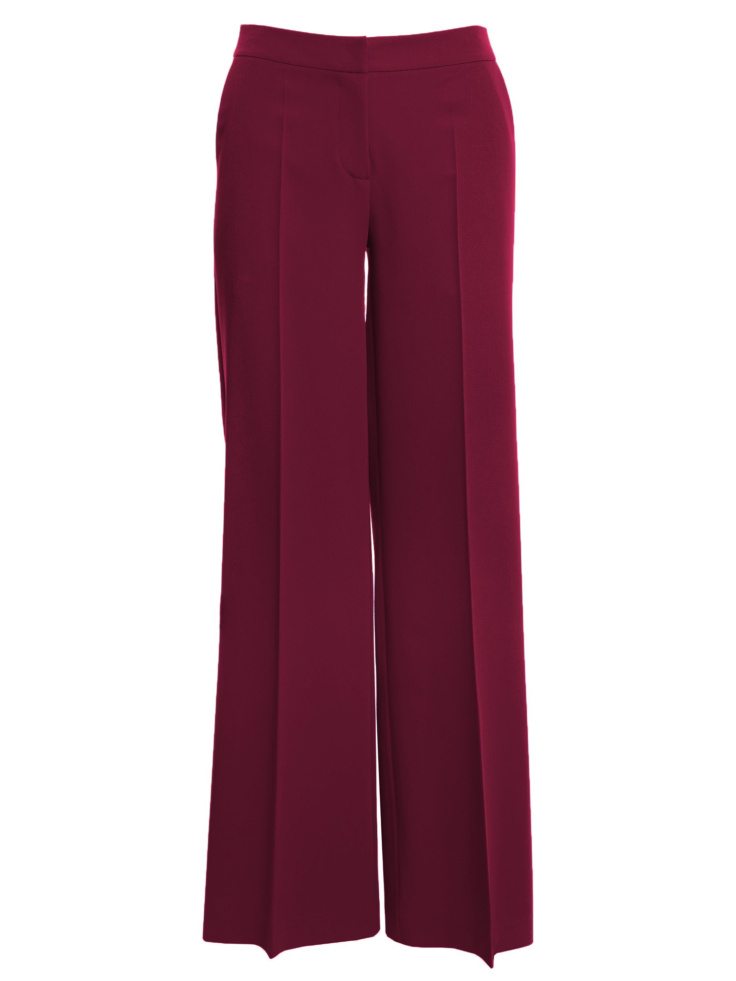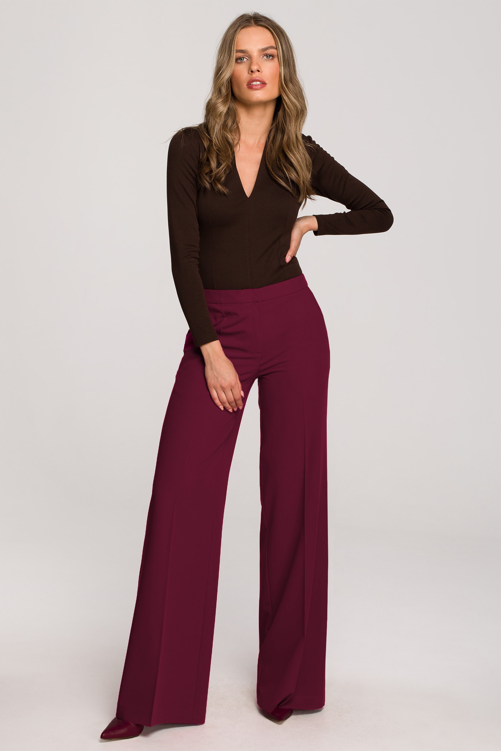 Szerokie spodnie z nogawkami w kant to świetna baza modnych stylizacji - zdecydowanie powinnaś je mieć w swojej kolekcji! Bordowe spodnie z nogawkami w kant optycznie wydłużają nogi, tuszując ich ewentualne niedoskonałości. Wysoki stan pięknie podkreśla talię. Posiadają dwie kieszenie z przodu oraz są zapinane na suwak. Tworzą elegancki komplet z marynarką zapinaną na jeden guzik, dostępną w naszej kolekcji, ale to nie jedyna opcja, w której możesz je nosić. Połącz je na przykład ze zwiewną koszulą i nie zapomnij o szpilkach lub sandałkach na obcasie. Stonowana gama kolorystyczna znakomicie pasuje do eleganckich kreacji! Spodnie wyprodukowane w Polsce.
