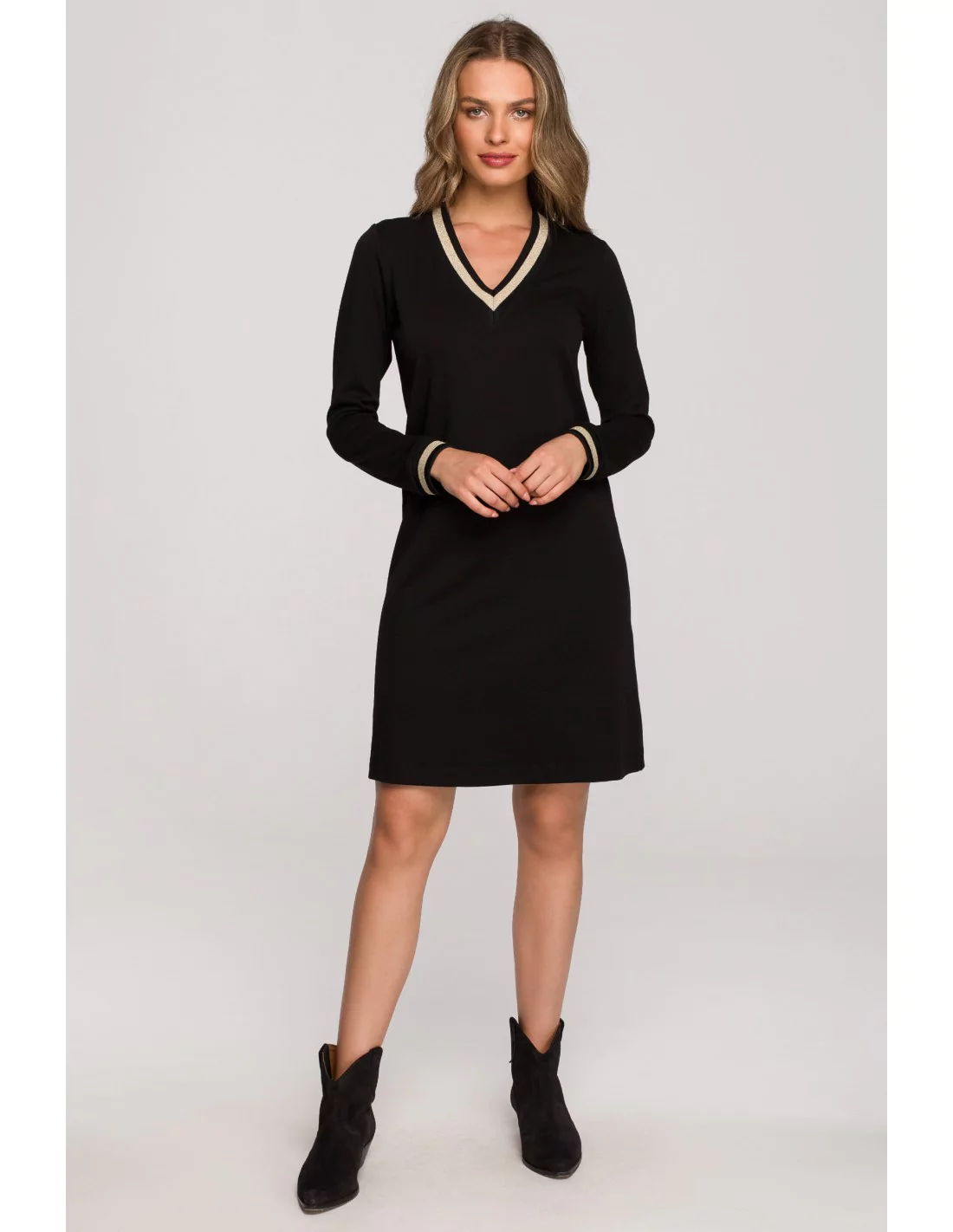 Dzianinowa sukienka, w której główną rolę grają ściągacze - dwukolorowe z połyskująca nitką. Wykończone nimi rękawy oraz dekolt stanowią ciekawą ozdobę oraz zdecydowanie decydują o jej niebanalnym charakterze. Czarna sukienka z dekoltem V znakomicie prezentuje się zarówno w sportowej, jak i casualowej stylizacji. Założysz ją na przykład do sneakersów, mokasynów, czy zamszowych botków. Sukienka ma kształt litery A, długie rękawy i sięga przed kolano. Uszyta została z przyjemnego dla ciała, elastycznego i miękkiego materiału, który zapewnia nieograniczony komfort użytkowania. Sukienka wyprodukowana w Polsce.