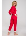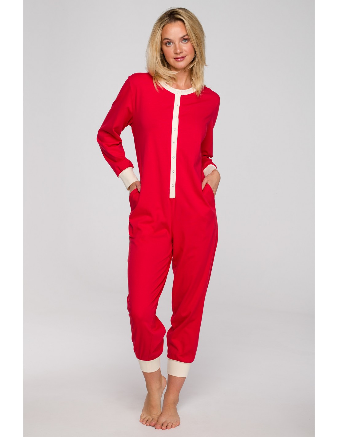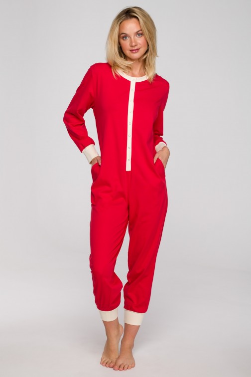 Śpij dobrze w naszym jednoczęściowym kombinezonie! Nie może być inaczej, ponieważ gwarantuje maksimum wygody i komfortu, co jest niezwykle istotne w przypadku bielizny nocnej. Aby znacząco podnieść jakość Twojego snu wykonaliśmy go z przewiewnej, miłej w dotyku oraz dla ciała bawełny. Jest ona również niezwykle trwała, więc decydując się na nią możesz mieć pewność, że posłuży Ci na długo. Czerwony kombinezon do spania zapinany jest na mini napy i posiada okrągły dekolt, długie rękawy oraz nogawki długości ⅞. Kontrastowe wykończenia wpływają na ciekawy efekt całości. Kombinezon wyprodukowaliśmy w Polsce.