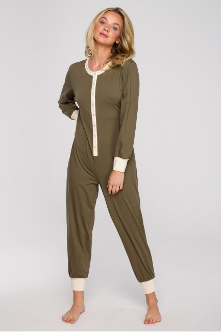 Śpij dobrze w naszym jednoczęściowym kombinezonie! Nie może być inaczej, ponieważ gwarantuje maksimum wygody i komfortu, co jest niezwykle istotne w przypadku bielizny nocnej. Aby znacząco podnieść jakość Twojego snu wykonaliśmy go z przewiewnej, miłej w dotyku oraz dla ciała bawełny. Jest ona również bardzo trwała, więc decydując się na nią możesz mieć pewność, że posłuży Ci na lata. Kombinezon do spania w kolorze khaki zapinany jest na mini napy i posiada okrągły dekolt, długie rękawy oraz nogawki długości ⅞. Kontrastowe wykończenia wpływają na oryginalny efekt całości. Kombinezon wyprodukowaliśmy w Polsce.
