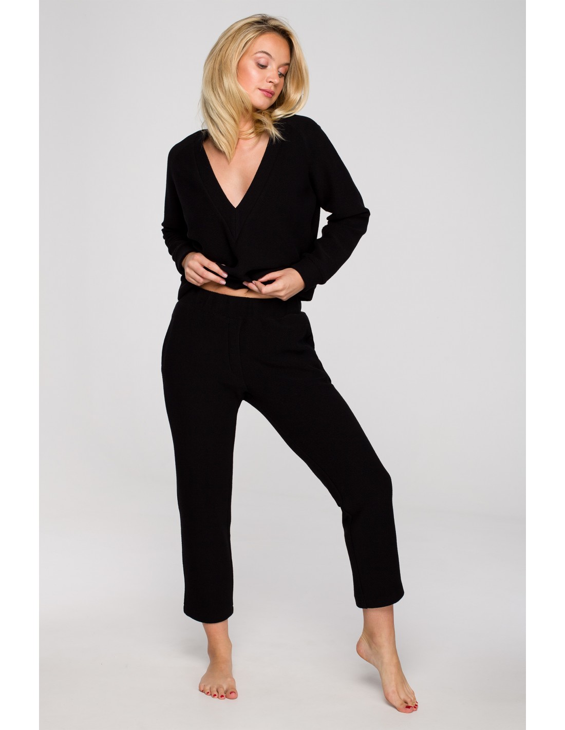 Czarne spodnie w stylu homewear - dodaj je do swojej domowej garderoby i poznaj nowy wymiar wygody! Materiał, z którego zostały wykonane jest przyjemny w dotyku, przyjazny dla skóry oraz bardzo trwały, co pozwoli Ci cieszyć się nimi na dłużej. Ma bardzo ciekawy diagonalny splot, który charakteryzuje się umieszczonymi po skosie prążkami. Spodnie posiadają elastyczny pas na gumie, dzięki czemu dopasują się do każdej sylwetki, a umieszczone po bokach kieszenie zapewne docenią zwolenniczki praktycznych rozwiązań. Nogawki mają długość ⅞ i delikatnie zwężają się u dołu. Stylowe spodnie po domu wyprodukowaliśmy w Polsce.