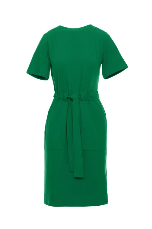 Zielona bawełniana sukienka z paskiem to połączenie wygody i stylu. Zaprojektowana z miękkiej i przyjemnej dla ciała dzianiny gwarantuje komfort przez cały dzień. Jej dopasowany krój podkreśla kobiecą sylwetkę, podczas gdy pasek do przewiązania w talii dodatkowo ją zaznacza. Dwie kieszenie naszyte na przodzie to praktyczny dodatek, który umożliwi Ci przechowywanie najpotrzebniejszych drobiazgów bez konieczności noszenia torebki. Sukienka posiada okrągły dekolt i krótkie rękawy, a także rozporek na boku, który umożliwia swobodny ruch. Doskonale prezentuje się z klapkami lub sandałkami na obcasie. Wyprodukowana w Polsce.