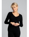 Czarna bluzka o luźnym fasonie w kwiaty. Dekolt z elastyczną falbanką, szerokie, długie rękawy, z tyłu ozdobne wycięcie zapinane na guzik.