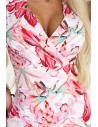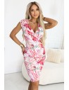 CM8165 Dopasowana sukienka z kopertowym dekoltem - biała w różowe kwiaty