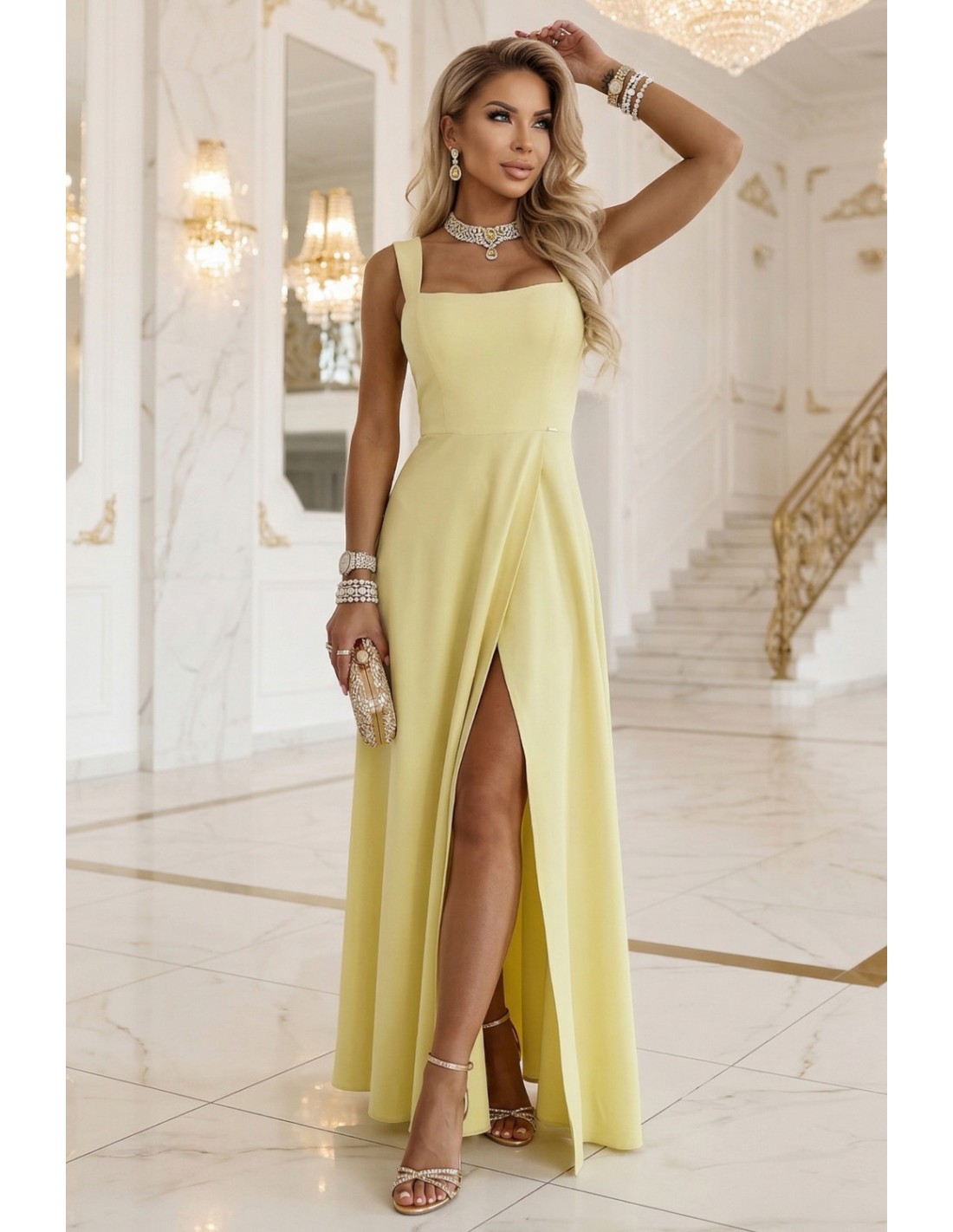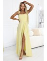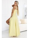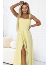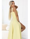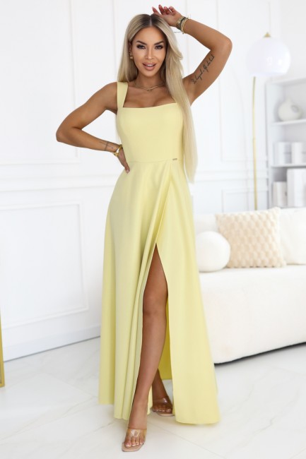 DM0857 Długa sukienka maxi z rozcięciem i dekoltem karo - żółta