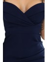 Sukienka wyróżnia się odkrytymi ramionami oraz dekoltem, a usztywnienie na biuście zapewnia doskonałe podtrzymanie i komfort. Z tyłu posiada praktyczny zamek, który ułatwia zakładanie. Dodatkowym elementem jest stylowe marszczenie na brzuchu, które nie tylko dodaje charakteru, ale także subtelnie maskuje ewentualne niedoskonałości. Idealna na wieczorne wyjścia i specjalne okazje.