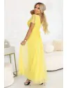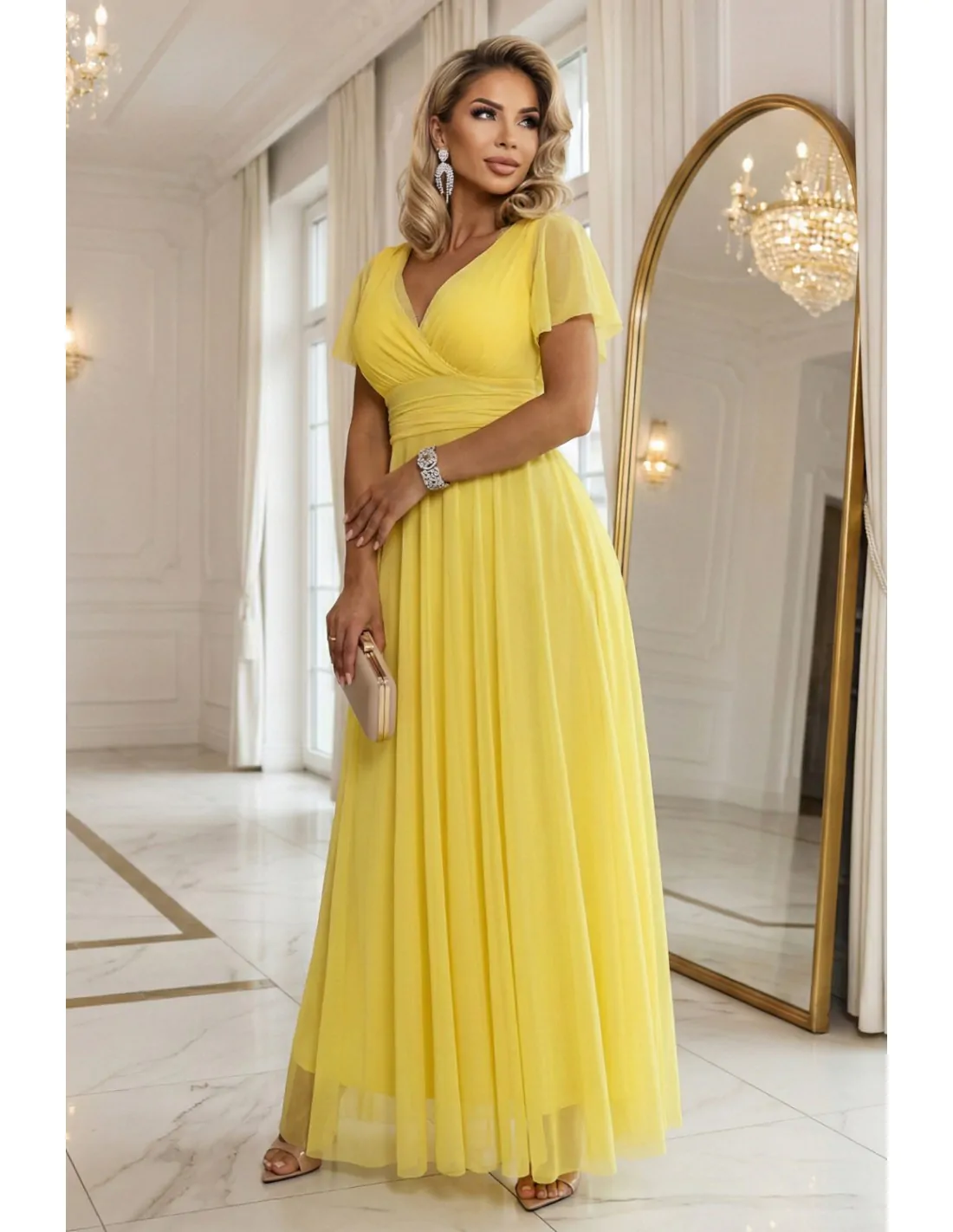 Długa kreacja z dekoltem i krótkim rękawkiem. Wykonana z lekkiego tiulu, który dodaje jej zwiewności i lekkości. Sukienka posiada usztywniane miseczki, co zapewnia doskonałe podtrzymanie, a wiązanie w pasie subtelnie podkreśla talię. To wyjątkowa propozycja o kobiecym i romantycznym charakterze. Idealna na wieczorne wyjścia i specjalne uroczystości.