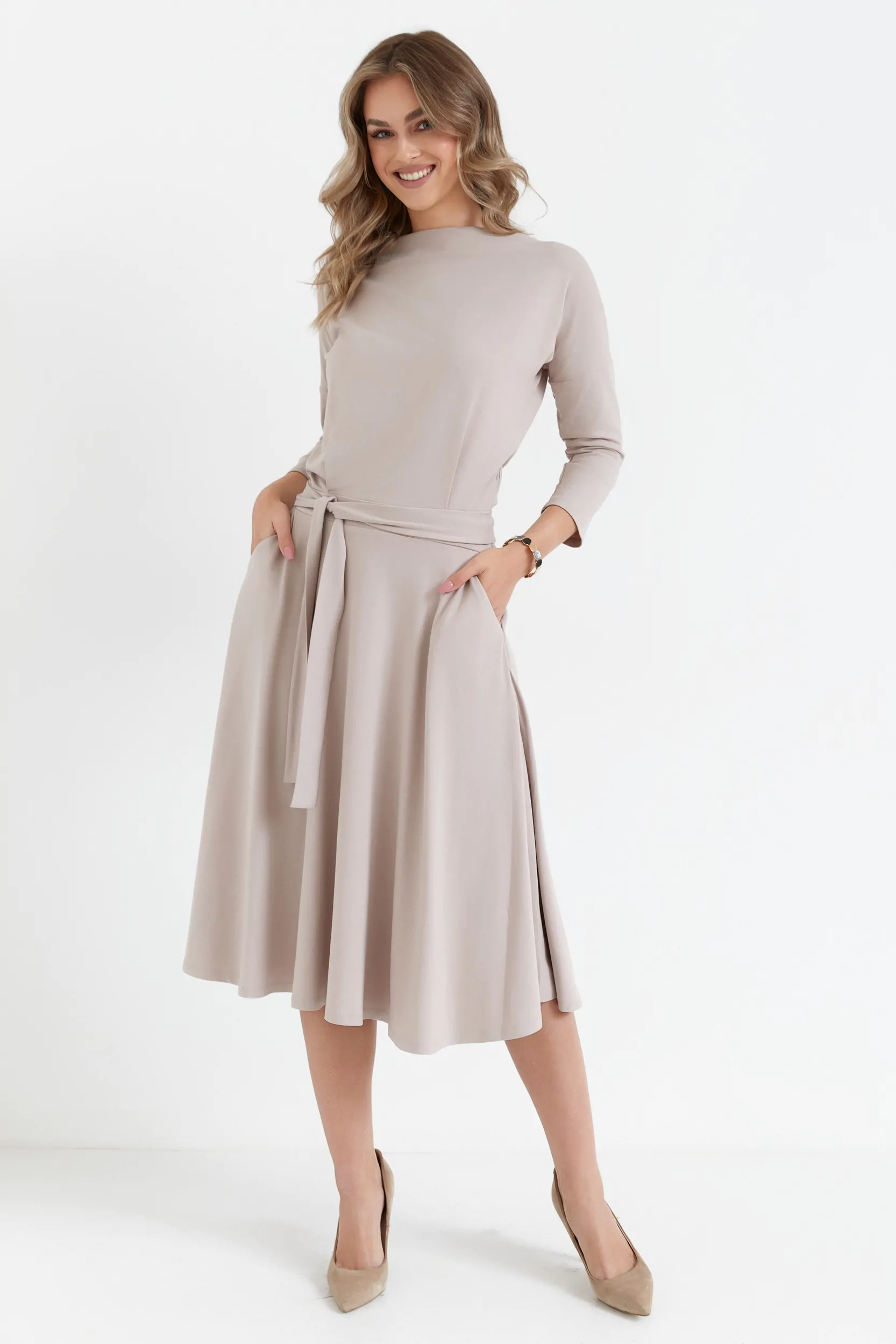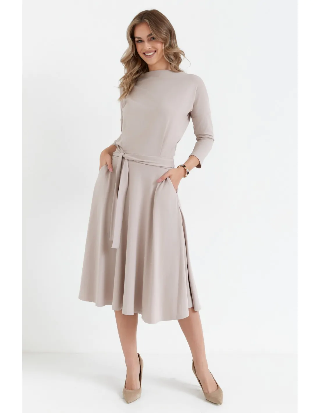 Wiskozowa sukienka rozkloszowana z paskiem – beżowa