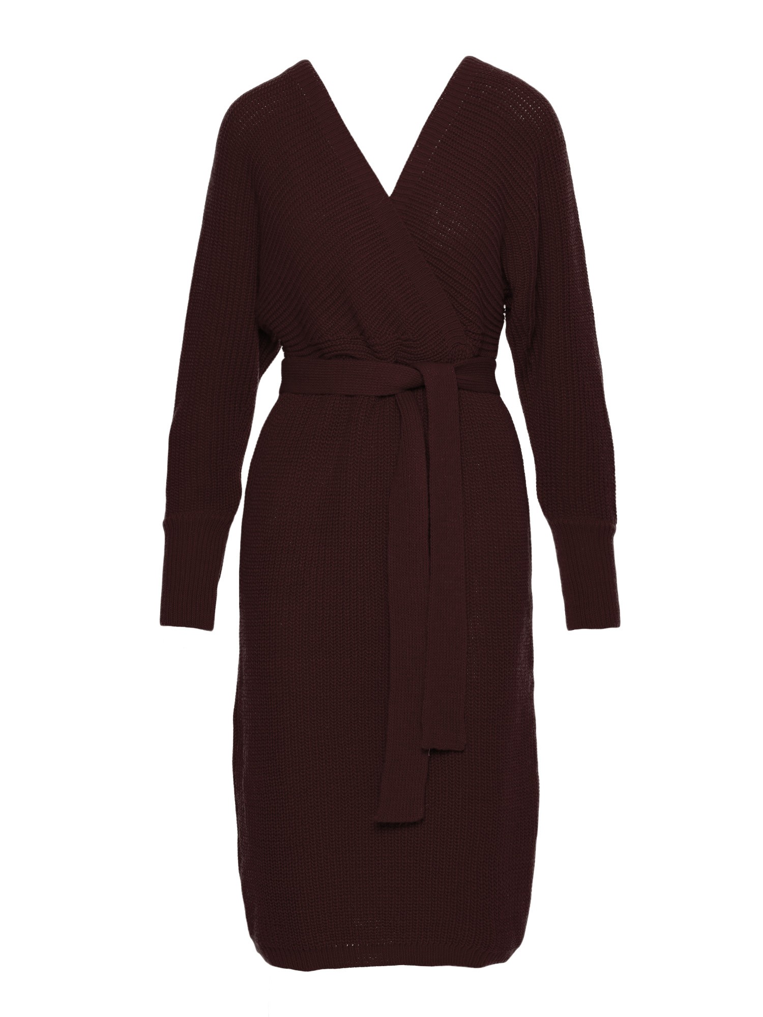 Sukienka swetrowa z dekoltem kopertowym i paskiem – brązowa