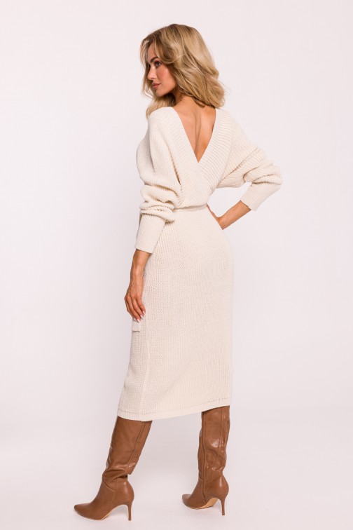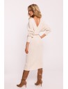 DM1017 Sukienka swetrowa z dekoltem kopertowym i paskiem – kość słoniowa