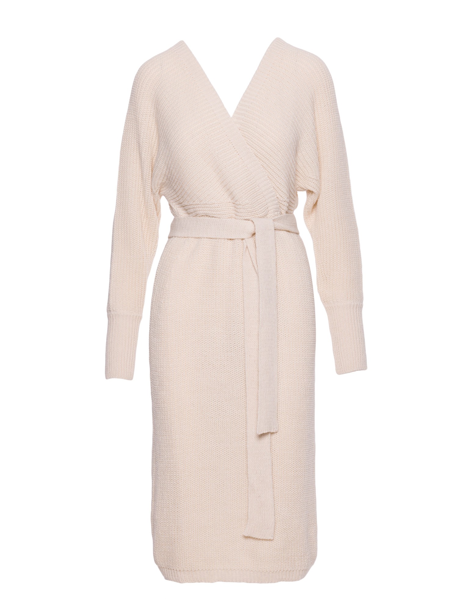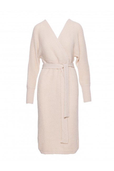 Sukienka swetrowa z dekoltem kopertowym i paskiem – kość słoniowa