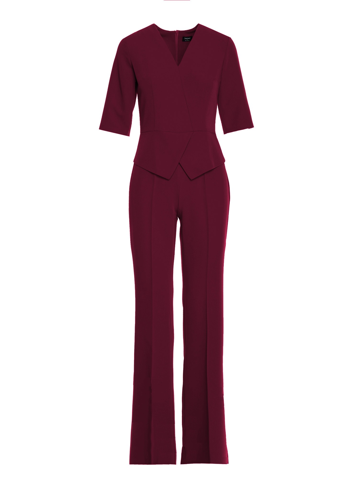 Kombinezon jako alternatywa dla sukienki? Uwielbiamy i jesteśmy zdecydowanie na tak! Bordowy kombinezon z uroczą baskinką to oryginalny strój, który zapewni Ci wygodę i świetną prezencję podczas wielu sytuacji. Posiada dekolt V, nogawki zaprasowane na kant i poszerzane u dołu oraz krótkie rękawy. Z tyłu na wysokości talii ma pionowe przeszycia, które modelują sylwetkę i sprawiają, że wygląda ona obłędnie! Ten kombinezon jest doskonałym wyborem na komunię, wesele lub inne ważne uroczystości w Twoim życiu. Został zaprojektowany i uszyty w Polsce.
