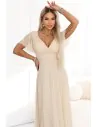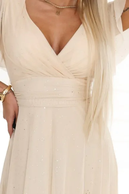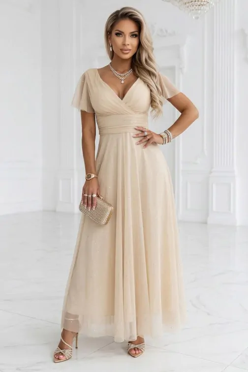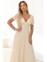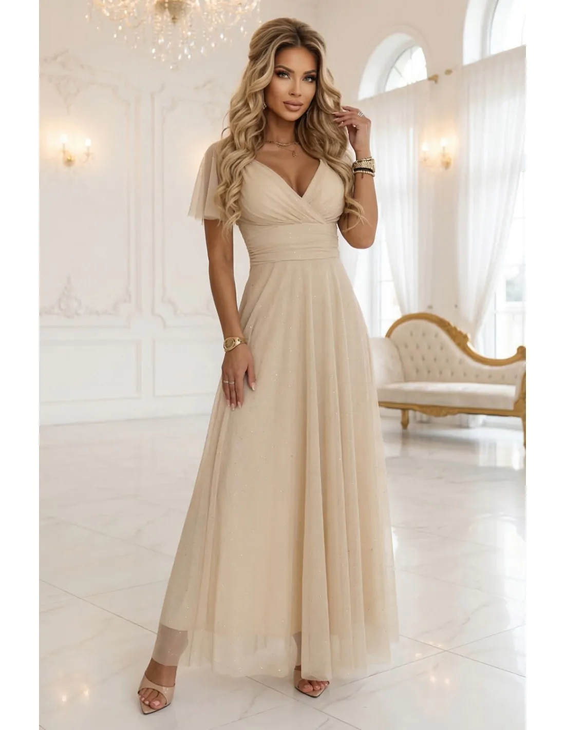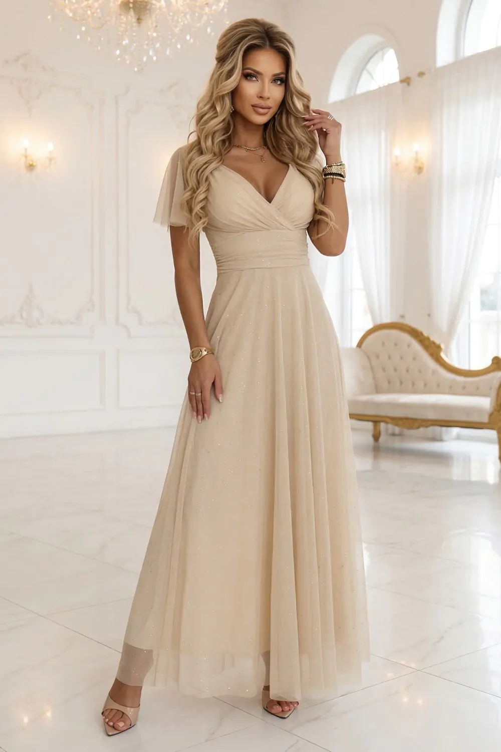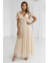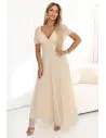 DM1404 Elegancka sukienka maxi z dekoltem V - beżowa