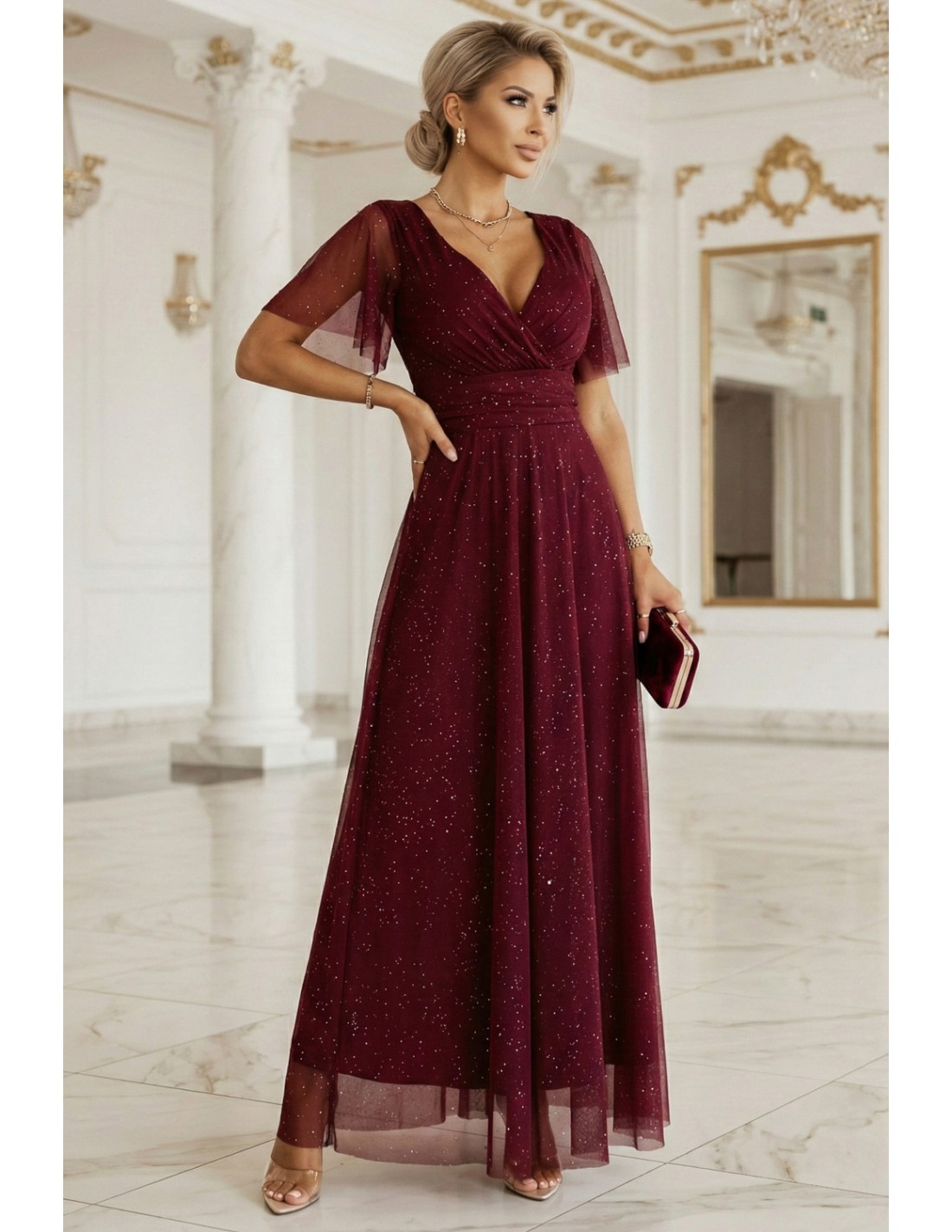 Długa błyszcząca suknia to elegancka propozycja na wyjątkowe okazje. Dekolt w kształcie litery V subtelnie eksponuje szyję i dodaje lekkości, a krótki rękaw wprowadza delikatny akcent. Elastyczna tkanina z połyskiem pięknie układa się na sylwetce, zapewniając komfort podczas noszenia. Długość maxi podkreśla styl i szyk, czyniąc model idealnym wyborem na wieczorne wyjścia, gale czy wesela.