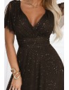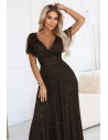 Długa błyszcząca suknia to elegancka propozycja na wyjątkowe okazje. Dekolt w kształcie litery V subtelnie eksponuje szyję i dodaje lekkości, a krótki rękaw wprowadza delikatny akcent. Elastyczna tkanina z połyskiem pięknie układa się na sylwetce, zapewniając komfort podczas noszenia. Długość maxi podkreśla styl i szyk, czyniąc model idealnym wyborem na wieczorne wyjścia, gale czy wesela.