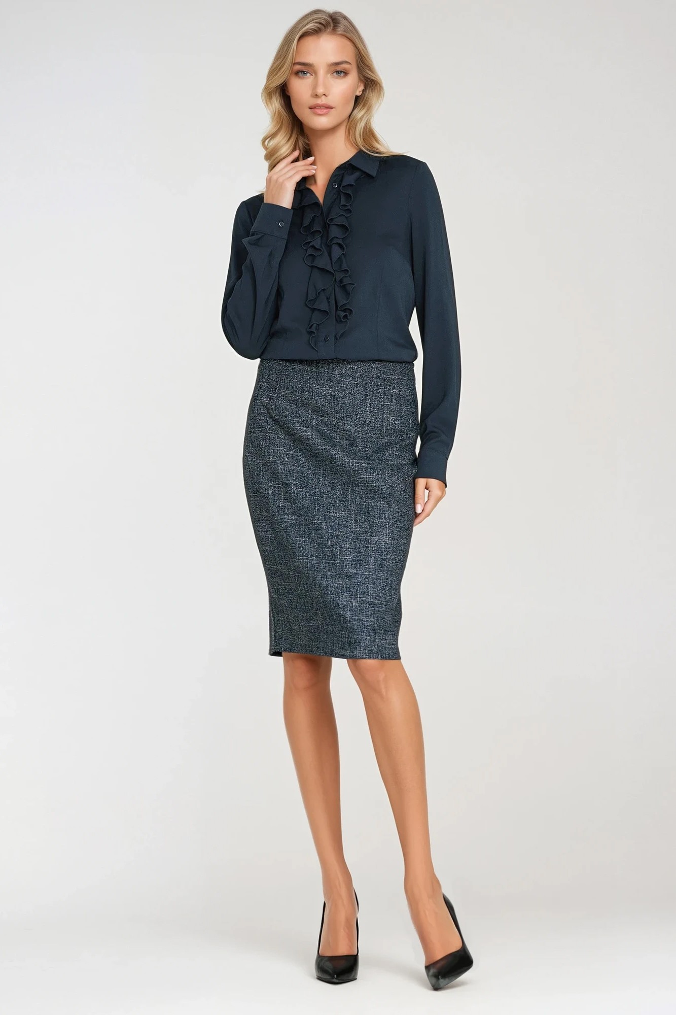 - Ponadczasowe spódnice i bluzki: Ołówkowe spódnice, rozkloszowane fasony i subtelne bluzki tworzą doskonałą bazę dla kobiecego, profesjonalnego wizerunku.