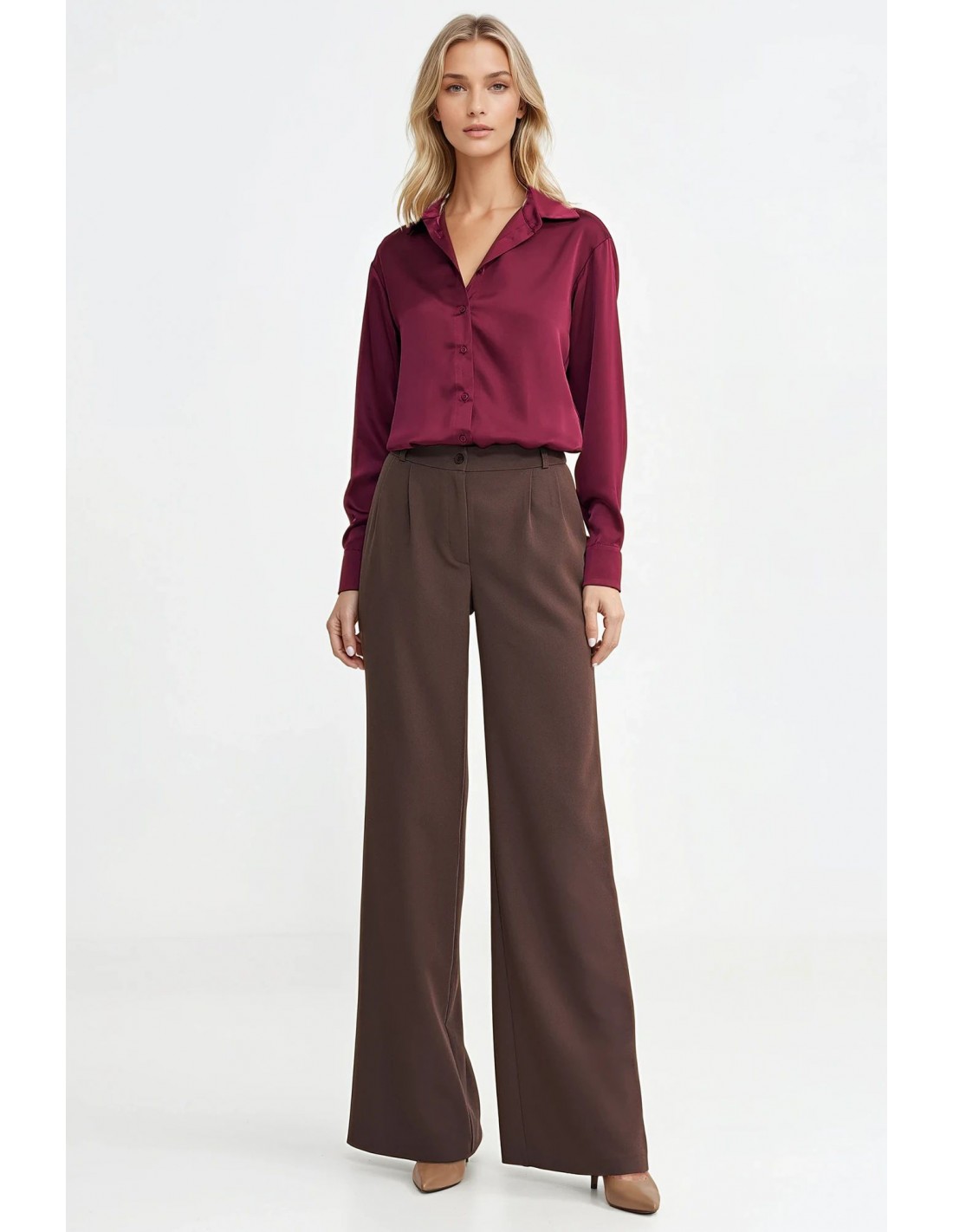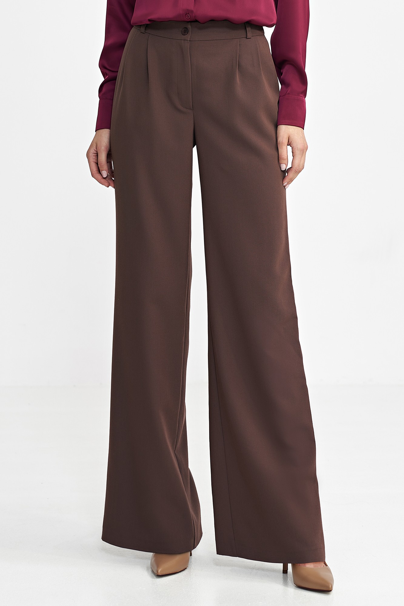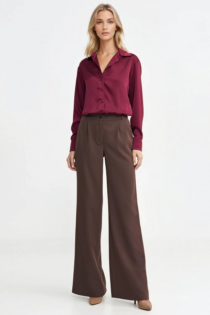 DM1413 Spodnie z zakładkami wide leg - brązowe
