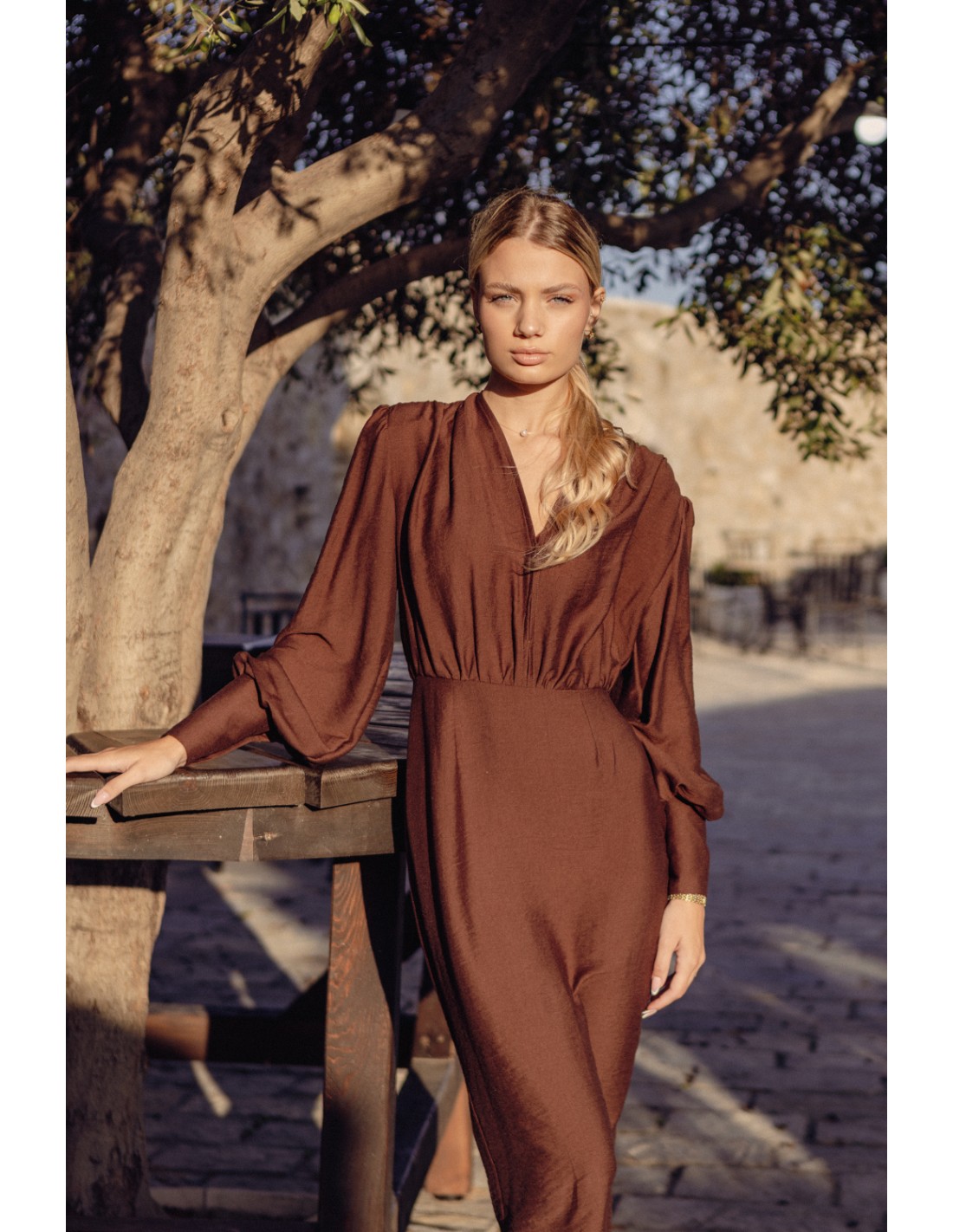 Elegancka sukienka midi z dekoltem w kształcie litery V i długimi rękawami to propozycja idealna na wyjątkowe okazje. Dopasowany krój subtelnie podkreśla biust, a marszczenie w talii optycznie wysmukla sylwetkę, nadając jej harmonijnych proporcji. Bufiaste rękawy zakończone szerokim mankietem dodają lekkości i elegancji, a ołówkowy dół zapewnia klasyczną linię sylwetki. Długość za kolano łączy w sobie kobiecość i szyk, dzięki czemu sukienka sprawdzi się na uroczyste wydarzenia, kolacje czy przyjęcia.