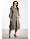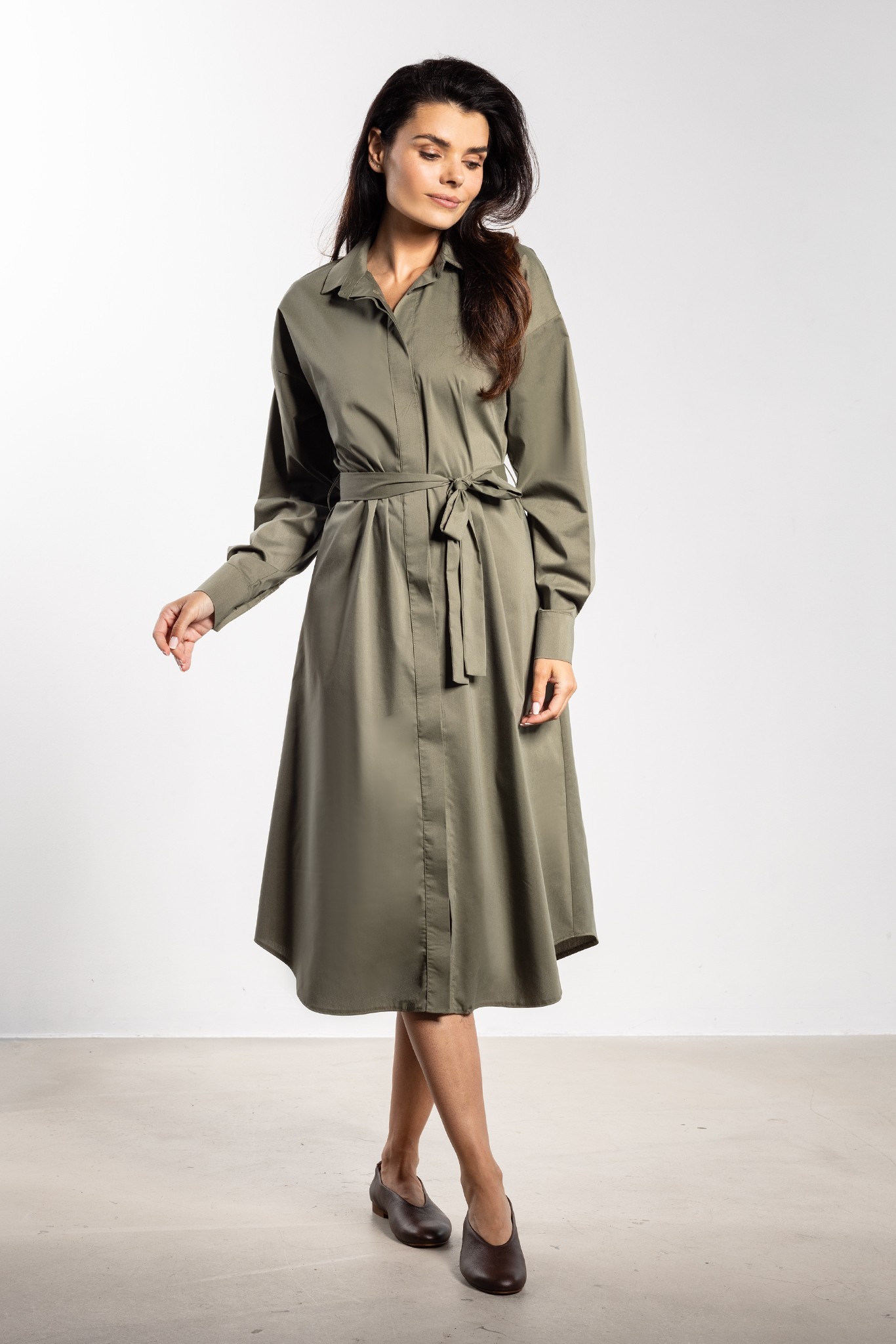 Sukienka koszulowa midi z paskiem i długimi rękawami łączy klasykę z wygodą, tworząc uniwersalną propozycję na różne okazje. Prosta linia zapinana na guziki na całej długości nadaje stylizacji lekkości, a klasyczny kołnierzyk i długie rękawy z mankietami podkreślają elegancki charakter. Pasek z tego samego materiału pozwala nosić sukienkę luźno lub przewiązaną w talii, akcentując kobiece proporcje sylwetki. Długość za kolano sprawia, że sukienka sprawdzi się zarówno do pracy, na spotkania, jak i wyjątkowe okazje.