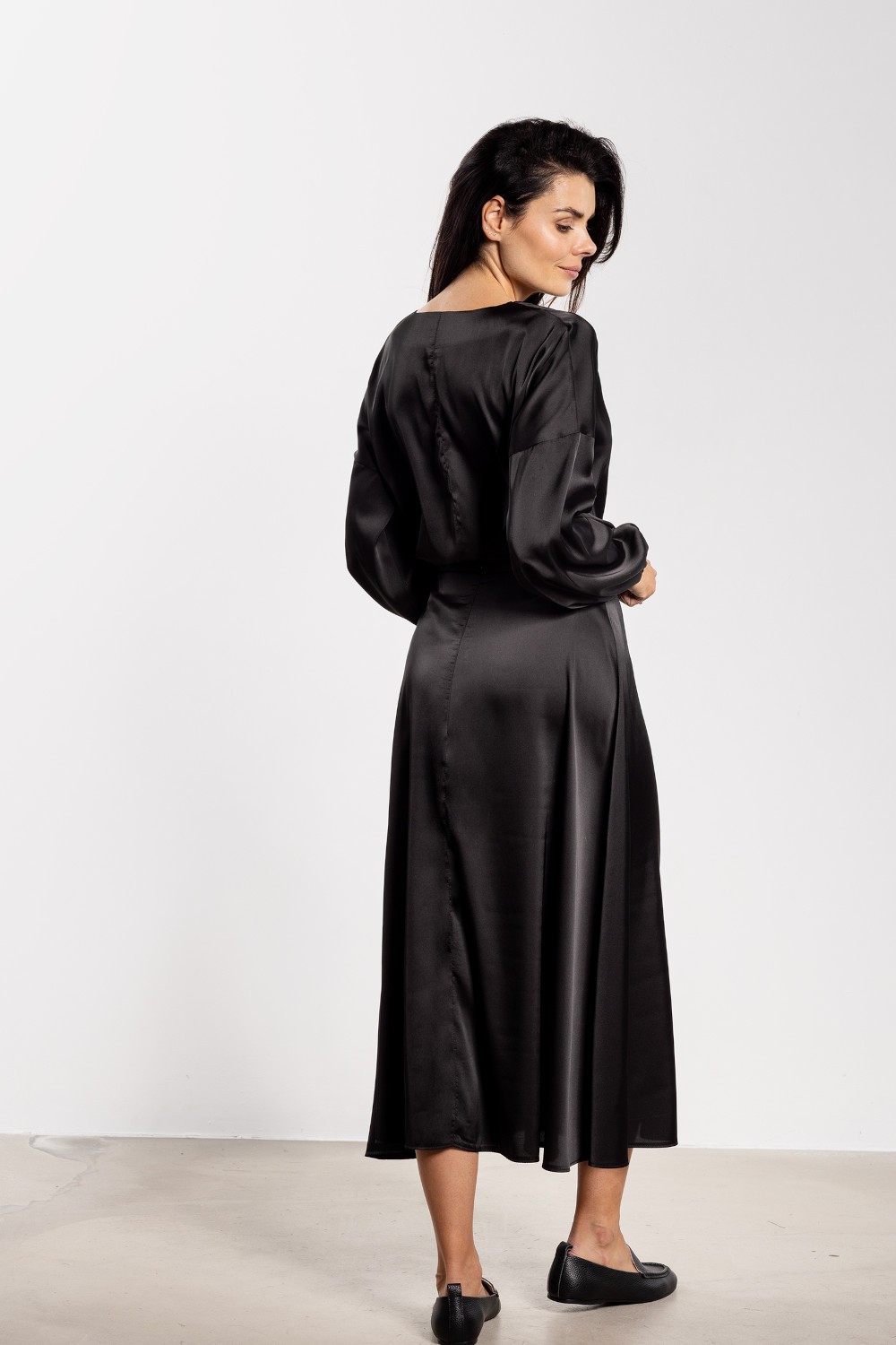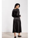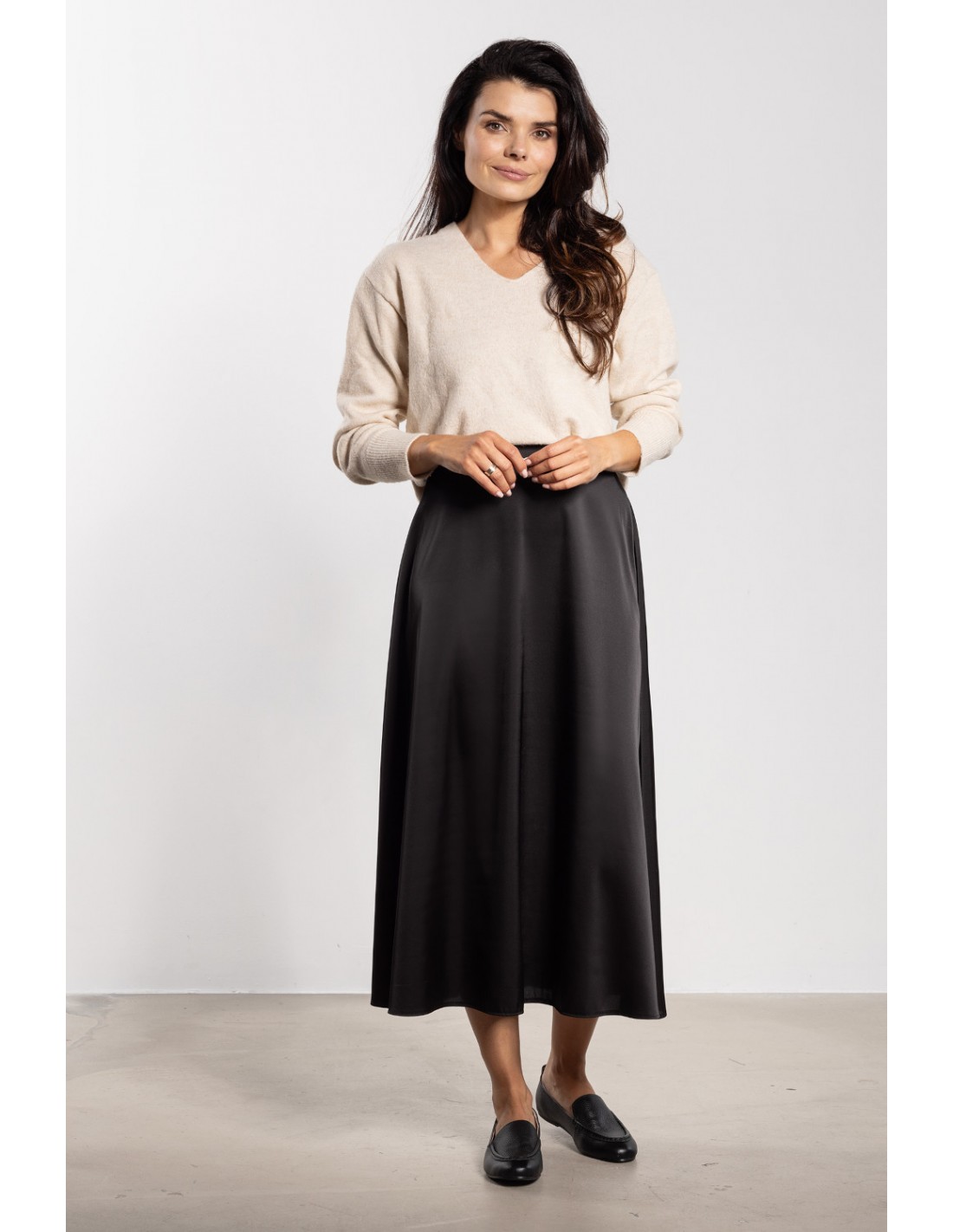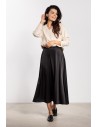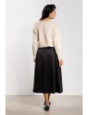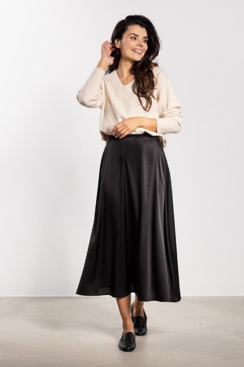 Satynowa spódnica midi z wysokim stanem to elegancki i ponadczasowy element garderoby. Delikatny połysk tkaniny dodaje stylizacji wyjątkowego charakteru, sprawdzając się zarówno na co dzień, jak i podczas bardziej formalnych okazji. Wysoki stan pięknie podkreśla talię i optycznie wydłuża sylwetkę, a rozkloszowany fason zapewnia swobodę ruchów i lekkość. Długość za kolano nadaje całości kobiecego i eleganckiego szyku.
