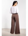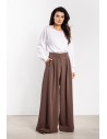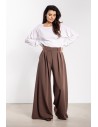 Eleganckie spodnie damskie z szeroką nogawką i wysokim stanem łączą wygodę z elegancją, tworząc uniwersalną propozycję na różne okazje. Wysoki stan podkreśla talię i optycznie wydłuża sylwetkę, a szerokie nogawki nadają lekkości i nowoczesnego charakteru. Model sprawdzi się zarówno w codziennych, jak i bardziej formalnych stylizacjach. Świetnie komponuje się z marynarką, koszulą czy swetrem, a praktyczne kieszenie boczne zwiększają funkcjonalność, pozwalając zachować wygodę w każdej sytuacji.