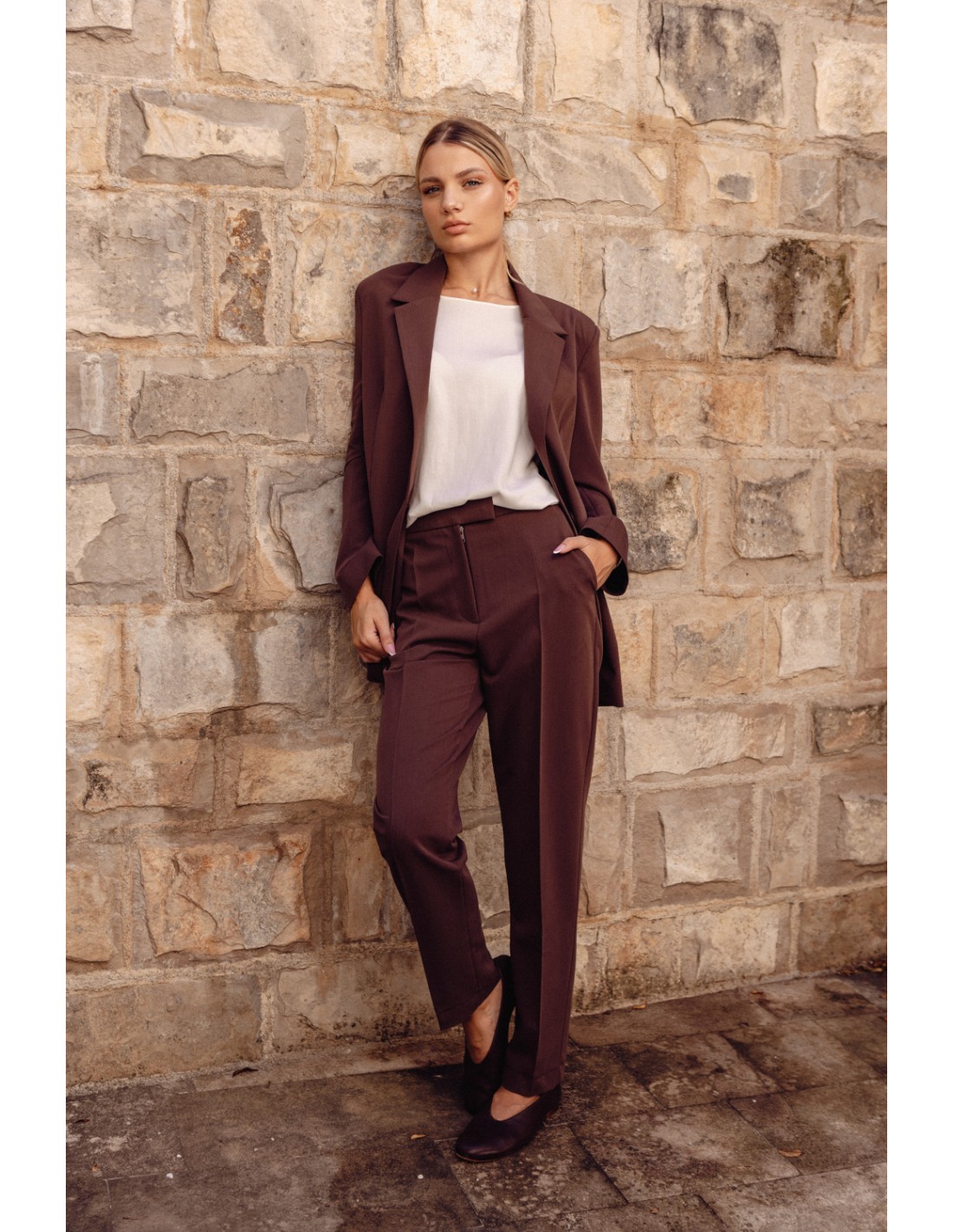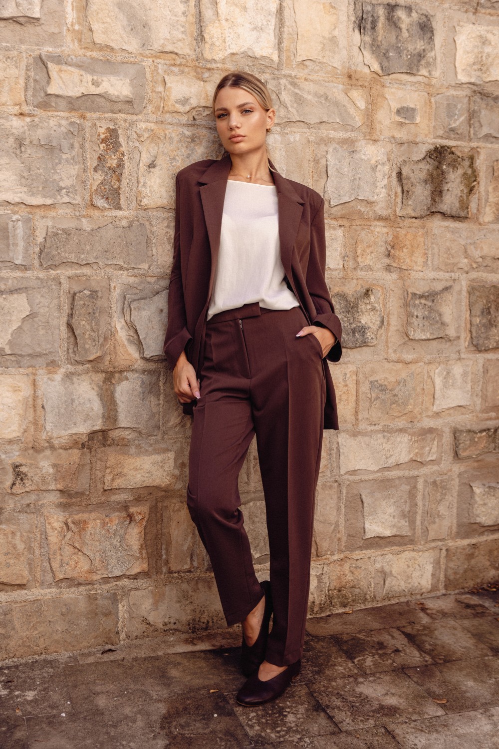Eleganckie spodnie cygaretki z kantem to klasyka, która doskonale sprawdzi się zarówno w biurze, jak i podczas wieczornych wyjść. Wysoki stan pięknie podkreśla talię, a prosty fason optycznie wydłuża nogi i wysmukla sylwetkę. Długość do kostek nadaje całości lekkości oraz nowoczesnego charakteru. Dzięki swojej uniwersalności spodnie można zestawić z marynarką i szpilkami, tworząc elegancki look, jak i z bluzką czy swetrem w codziennych stylizacjach.