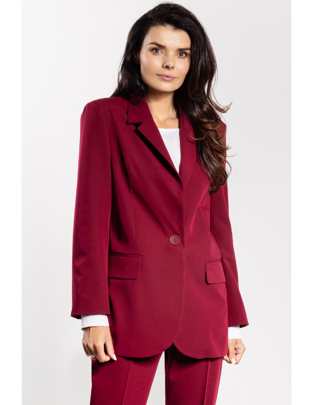 Klasyczna marynarka damska to ponadczasowy element garderoby, który doskonale łączy elegancję z komfortem. Luźny krój i prosta linia nadają sylwetce lekkości, a jednorzędowe zapięcie na guzik podkreśla profesjonalny, minimalistyczny charakter. Klasyczne klapy oraz praktyczne kieszenie z patką dodają stylu i funkcjonalności. To uniwersalny model, który świetnie sprawdzi się zarówno w biurze, podczas spotkań biznesowych, jak i w bardziej formalnych stylizacjach.