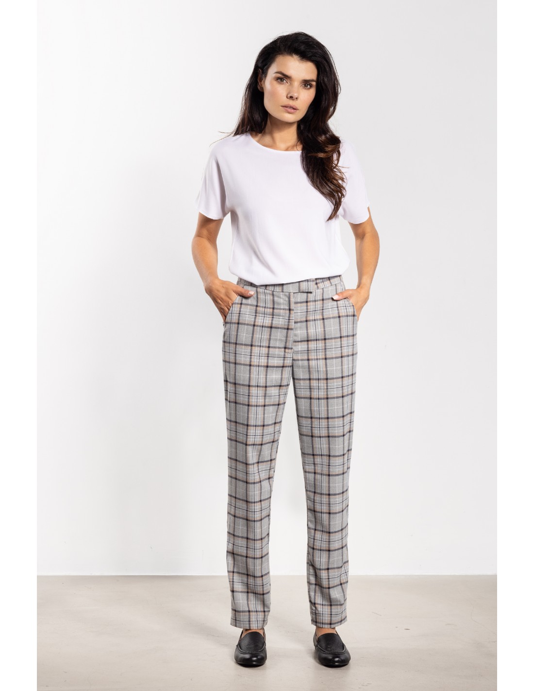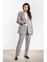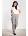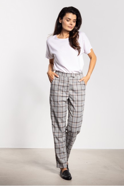 Eleganckie spodnie cygaretki w kratę to klasyka w nowoczesnym wydaniu. Dopasowany fason podkreśla sylwetkę, a średni stan zapewnia komfort noszenia. Ponadczasowy wzór kraty dodaje charakteru i sprawia, że spodnie świetnie sprawdzą się zarówno w biurze, jak i w codziennych stylizacjach. Boczne kieszenie zwiększają funkcjonalność, a uniwersalny design pozwala łączyć je z koszulami, marynarkami czy swetrami, tworząc eleganckie i stylowe zestawy.