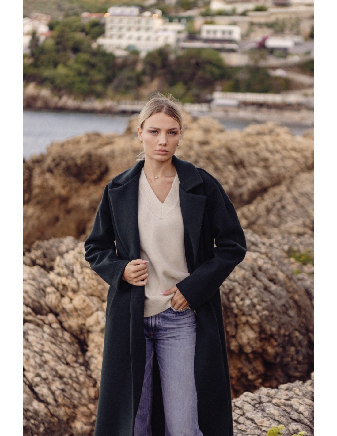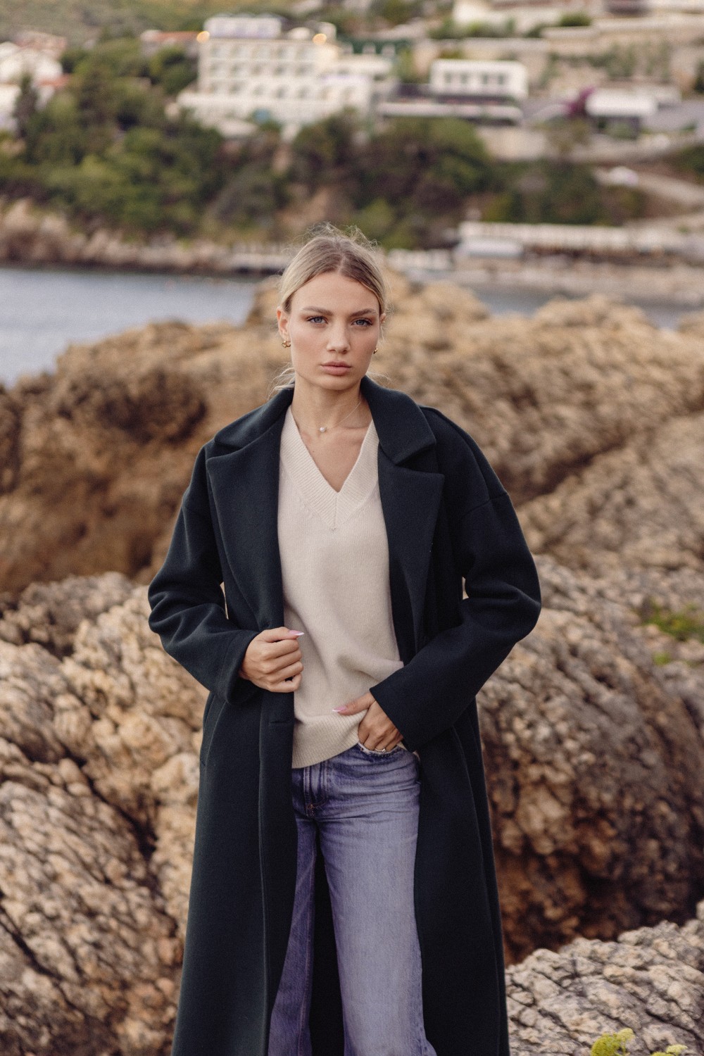 Długi płaszcz damski o prostym kroju to elegancki i ponadczasowy element garderoby, idealny na chłodniejsze dni. Minimalistyczny fason w długości midi nadaje sylwetce smukłości, a klasyczne klapy podkreślają szykowny charakter. Dołączony pasek pozwala regulować stylizację – można go nosić przewiązanego w talii, aby podkreślić kobiece kształty, lub luźno, dla bardziej casualowego efektu. Praktyczne kieszenie boczne dodają funkcjonalności, czyniąc płaszcz zarówno stylowym, jak i wygodnym w codziennym użytkowaniu.