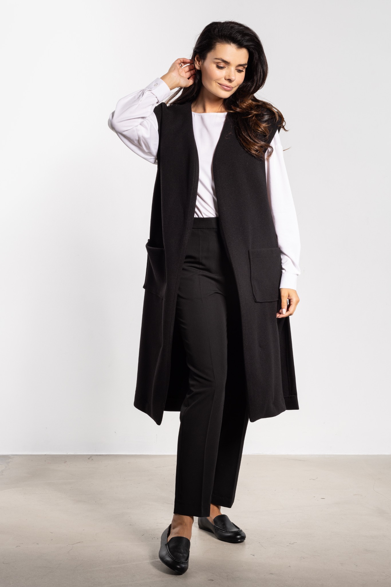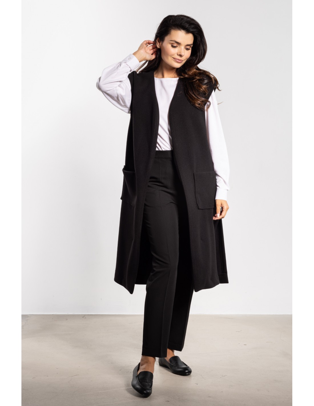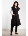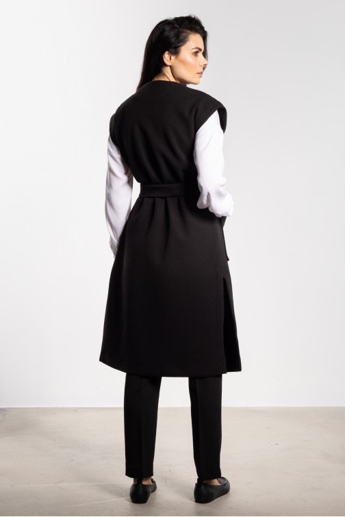 DM1448 Długa kamizelka flauszowa z paskiem i kieszeniami - czarna