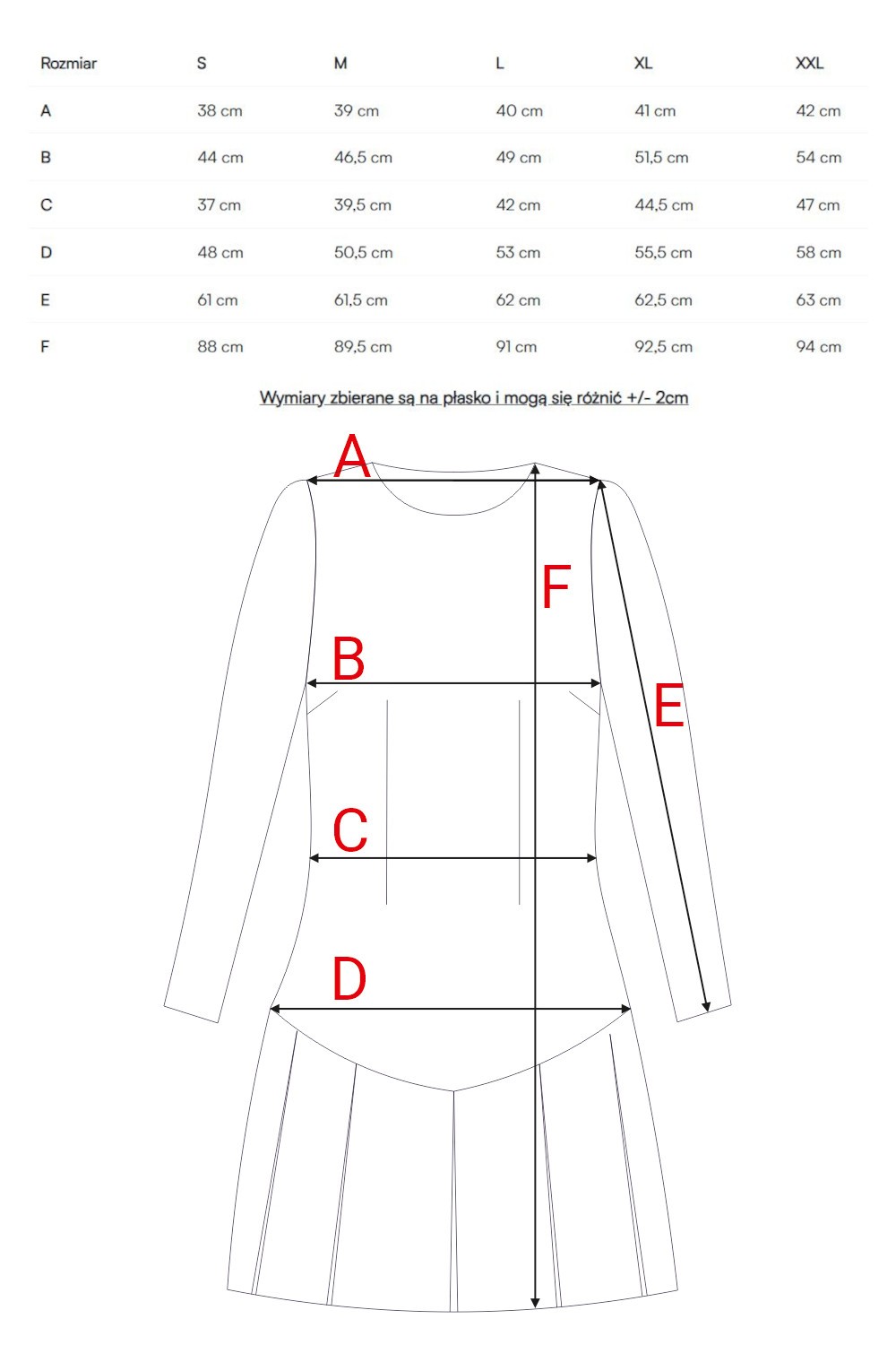 • Zastosowanie: elegancka sukienka idealna na wiele okazji – do pracy, na spotkania biznesowe, rodzinne uroczystości czy randkę. Minimalistyczna góra w połączeniu z kontrafałdami nadaje sylwetce lekkości.