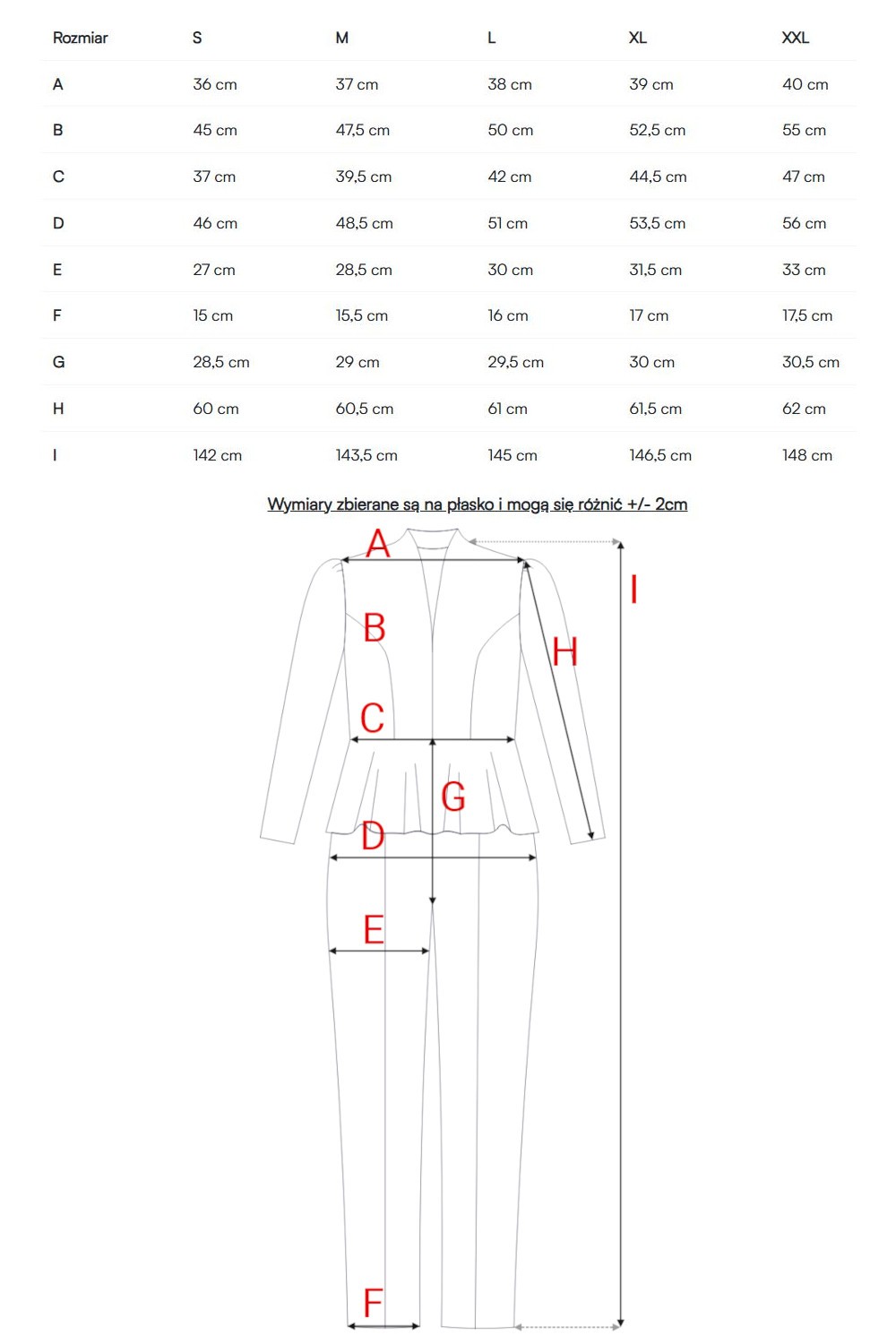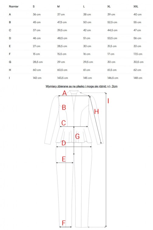 • Fason: jednoczęściowy kombinezon, dopasowany w górnej części, z baskinką zakrywającą biodra, część pośladków i brzuszek
