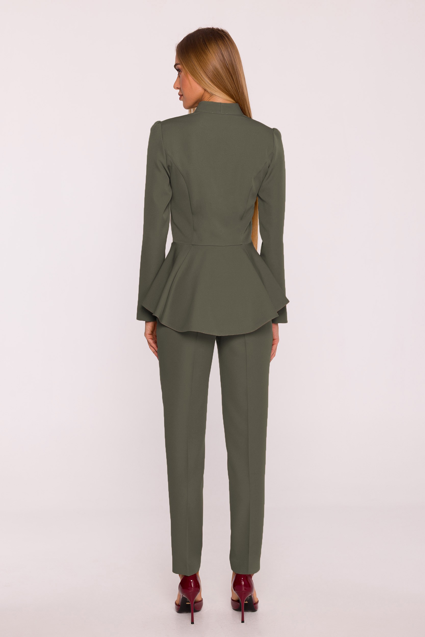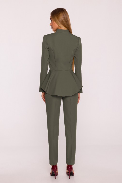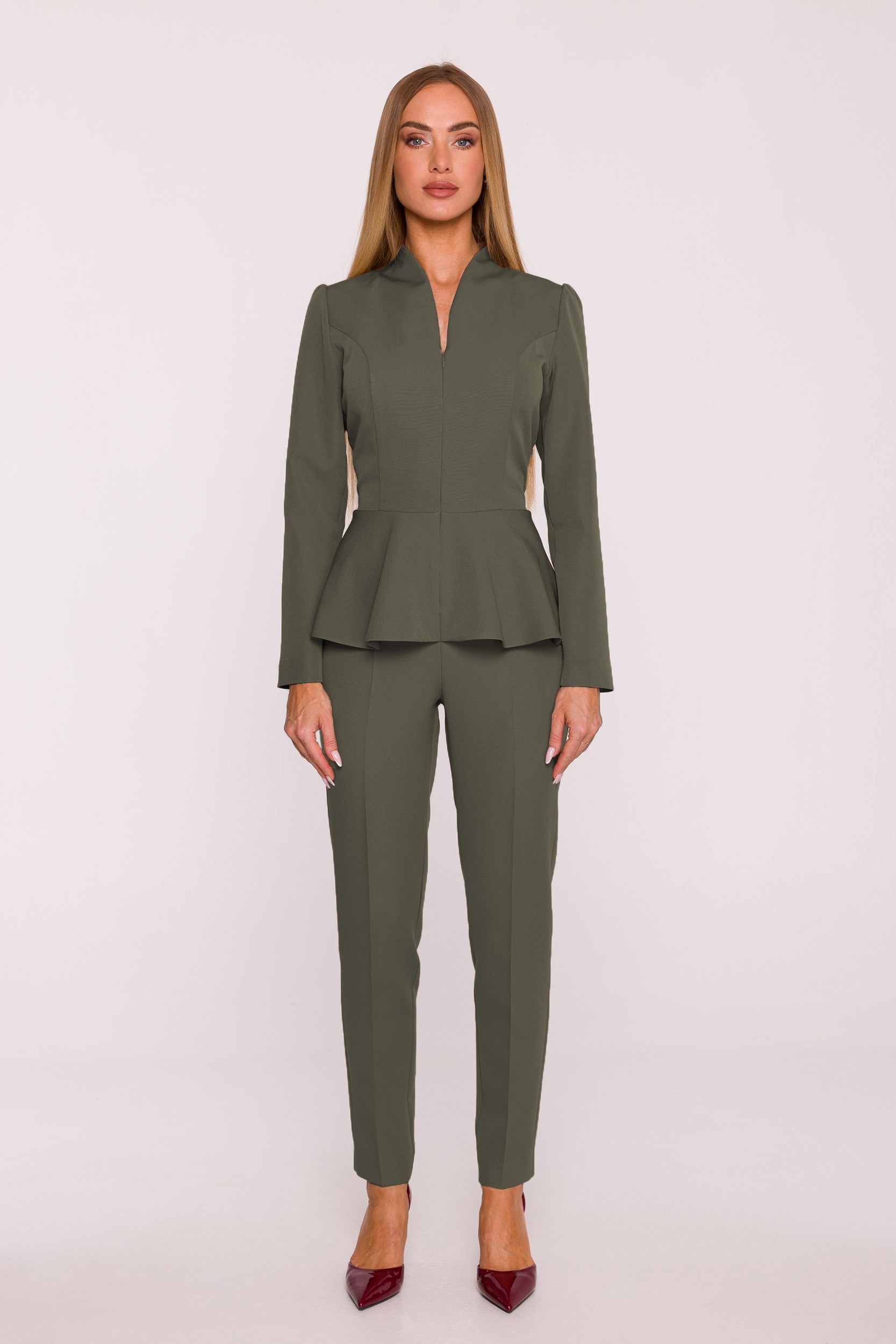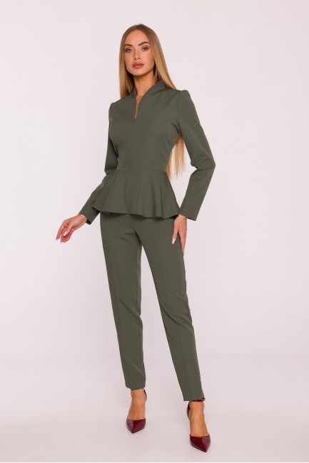 • Kształt: modelujący sylwetkę, z baskinką w talii i nogawkami zwężanymi do dołu