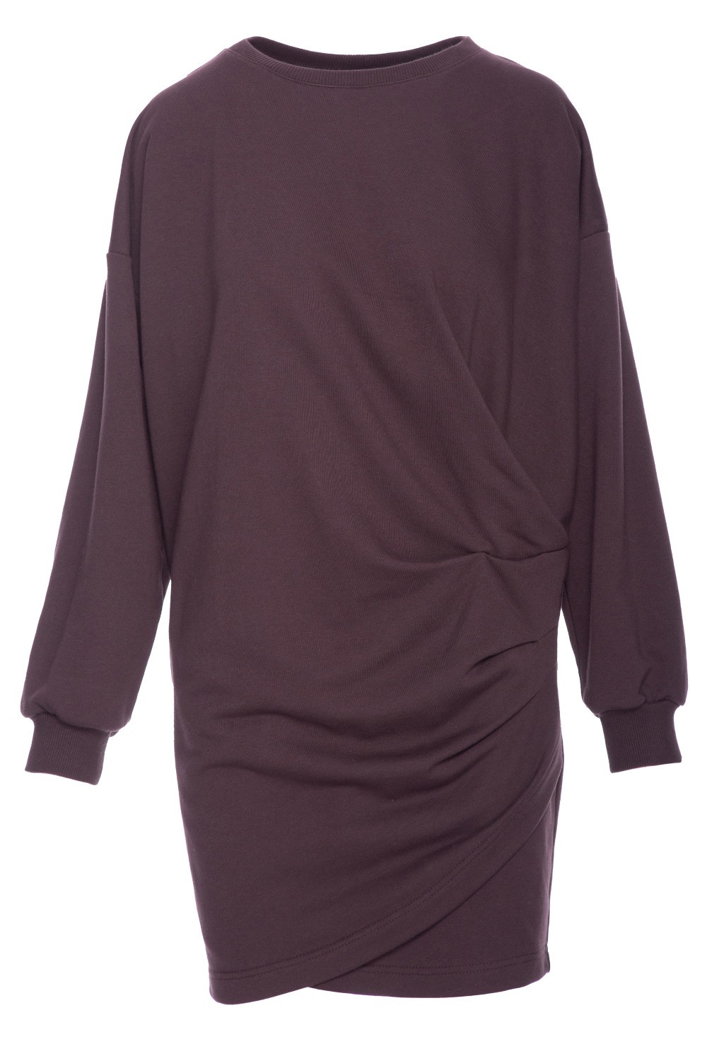 Sportowa sukienka z dzianiny uszyta z gładkiej dzianiny dresowej o gramaturze 280 g, z miękkim spodem typu pętelka. Model wkładany przez głowę, z okrągłym dekoltem pod szyję i długimi rękawami zakończonymi mankietami. Luźna góra w stylu oversize i dopasowany dół tworzą komfortowy, a jednocześnie kobiecy look. Idealna do codziennych stylizacji z sneakersami, kozakami lub trampkami.