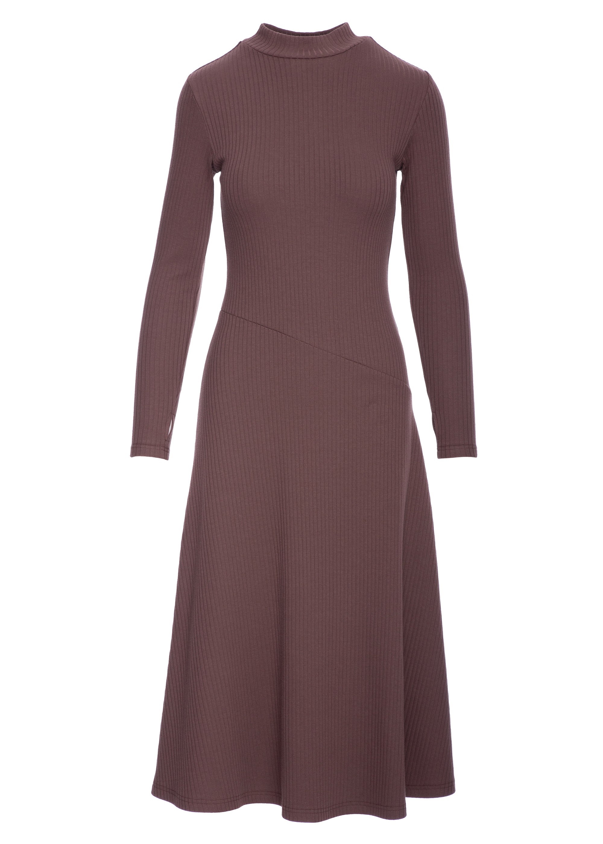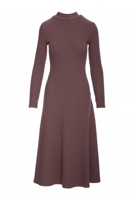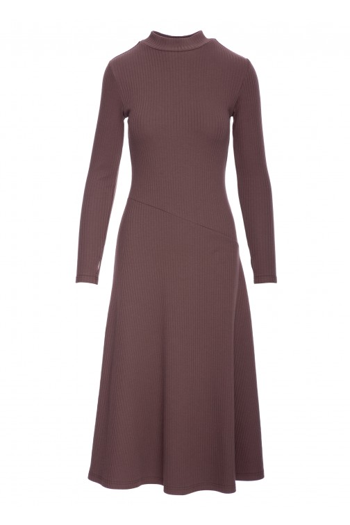 Dzianinowa sukienka prążkowana z długim rękawem - brązowa