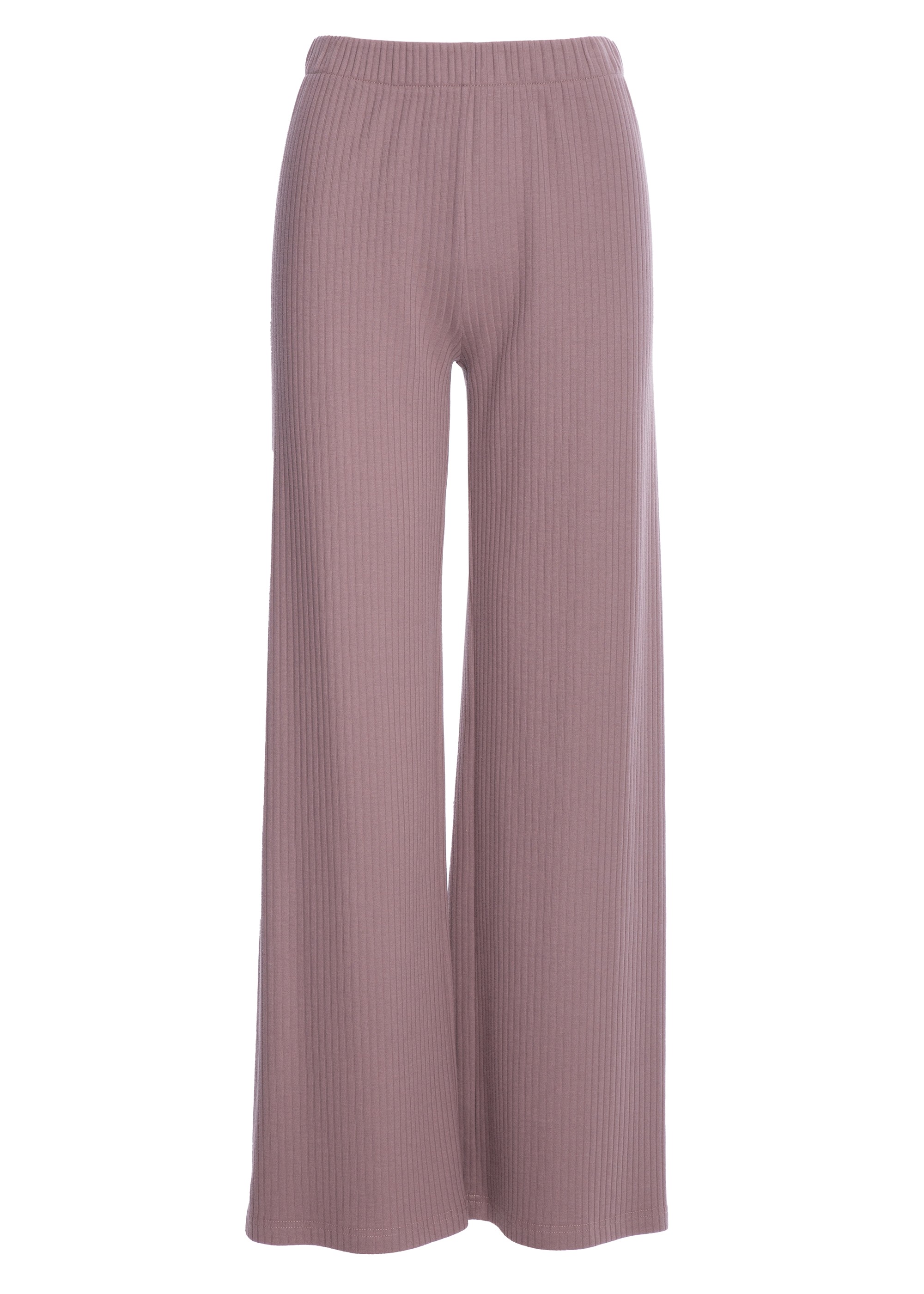 Dzianinowe spodnie casual wykonane z miękkiej, prążkowanej dzianiny o gramaturze 250 g. Dopasowane w talii dzięki elastycznej gumce, luźniejsze na całej długości nogawki, lekko rozszerzane, pełnej długości do ziemi. Idealne do codziennych stylizacji z bluzą, swetrem czy marynarką, łączą komfort z nowoczesnym wyglądem.